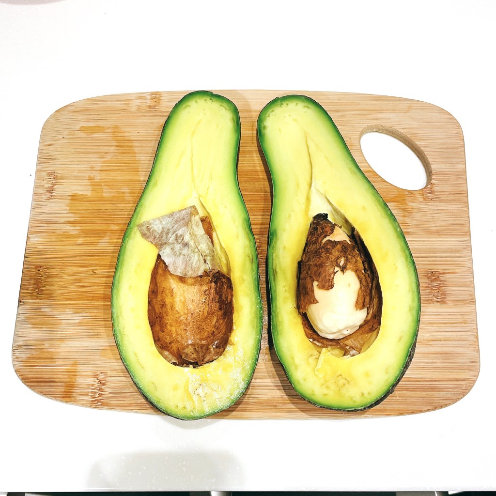 完全熟透的酪梨完全不需要花費力氣即可輕鬆剖半,裡面的大果籽幾乎無須吹灰之力就能掉出,如果遇到比較頑固的果實,也能學機智煮婦米飛用小湯匙輔助摳出。