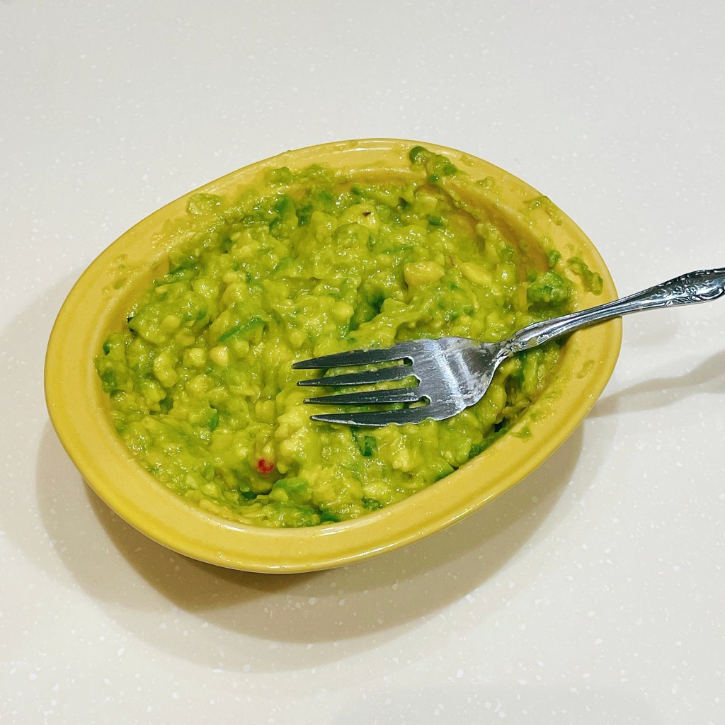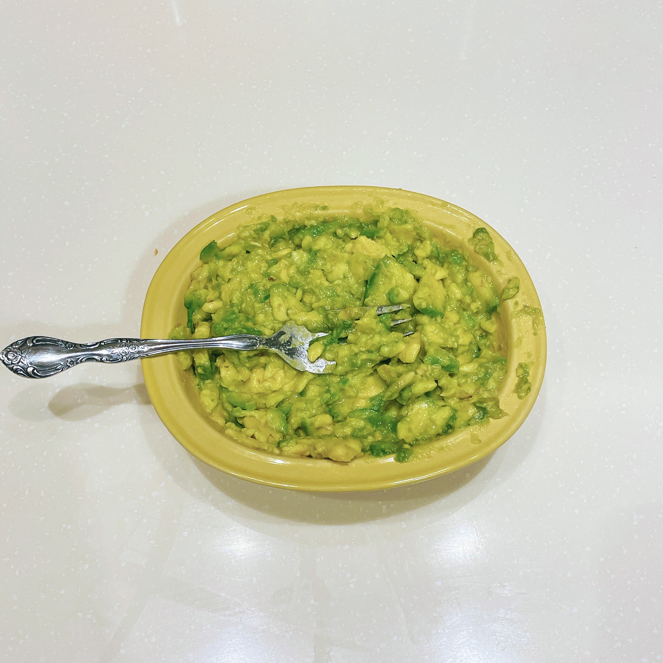 並拿叉子邊戳邊壓就能快速均勻地讓酪梨變成泥狀,