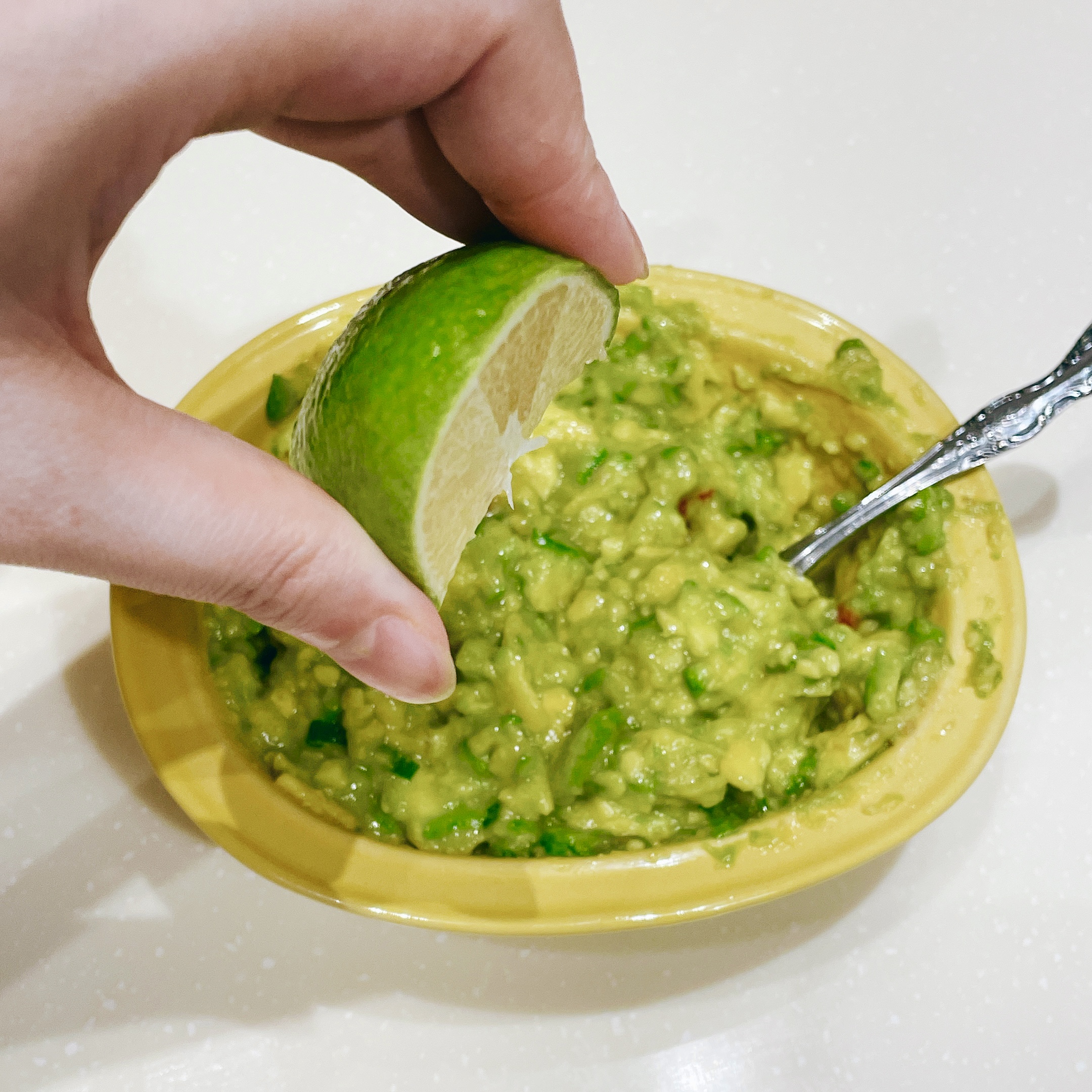 接下來撒上蔥花(1茶匙)、紅辣椒(1根)、鹽巴(1/4茶匙)和萊姆汁(半顆,記得剔除籽),邊攪拌邊試試味道,