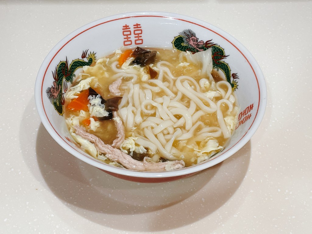 肉絲/木耳/高麗菜/紅蘿蔔大火快炒燴過再加高湯打蛋花。