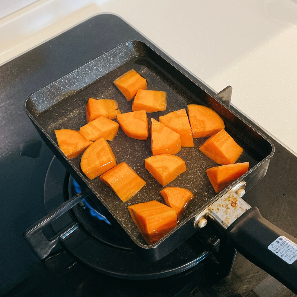 只要先用滾水加鹽巴(1茶匙),將削皮切塊的紅蘿蔔(150g)放進去煮5分鐘後放旁邊備用。
