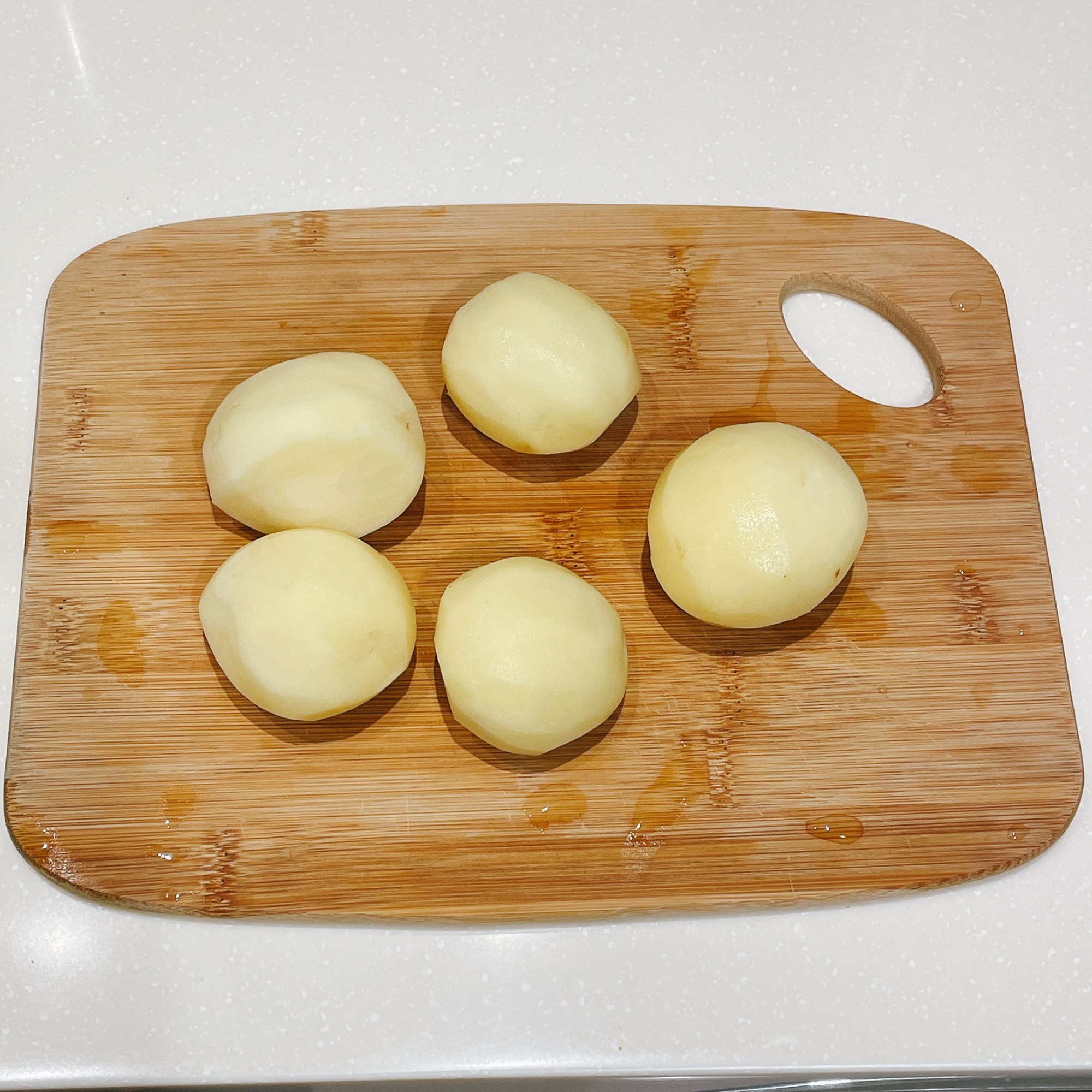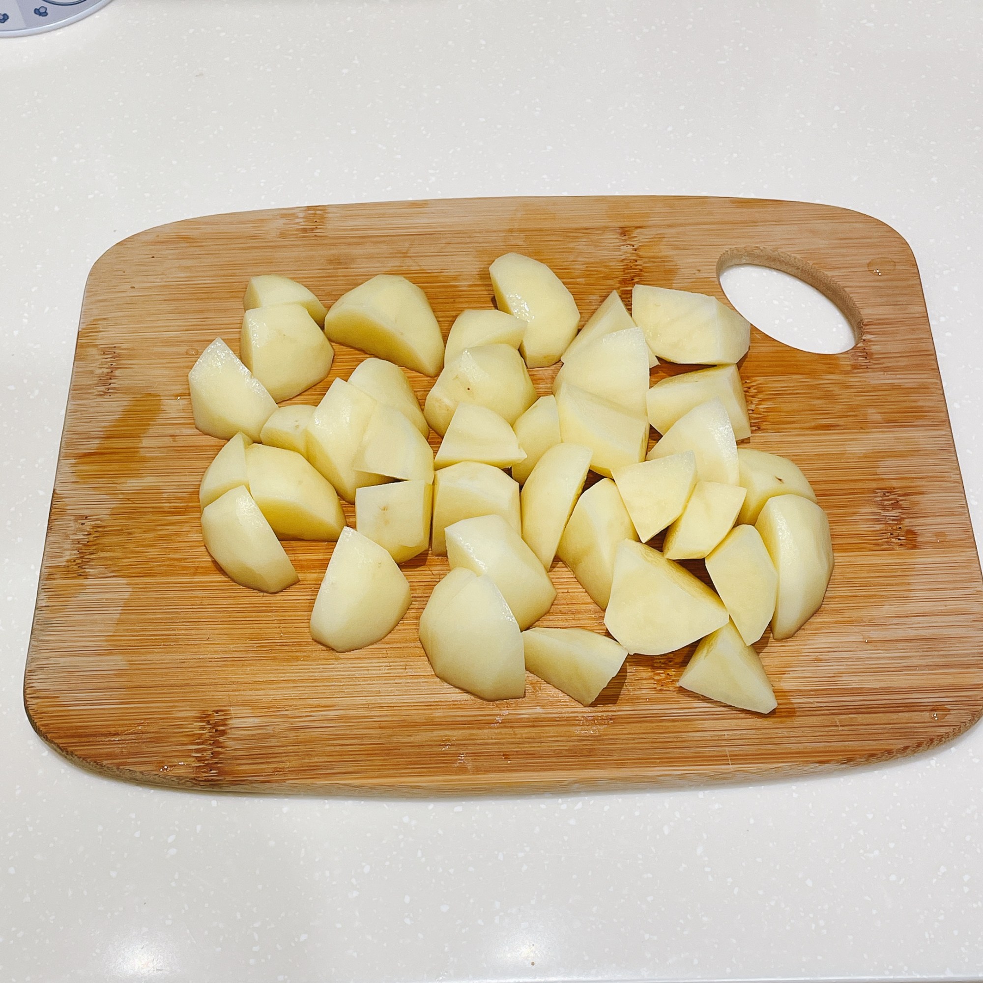 將澳洲馬鈴薯(400g)削皮後,滾刀切成小塊。這樣所有的食材都準備完畢,可以拿出鑄鐵鍋準備『嘟咕、嘟咕』燉一鍋美味的奶油燉菜啦!