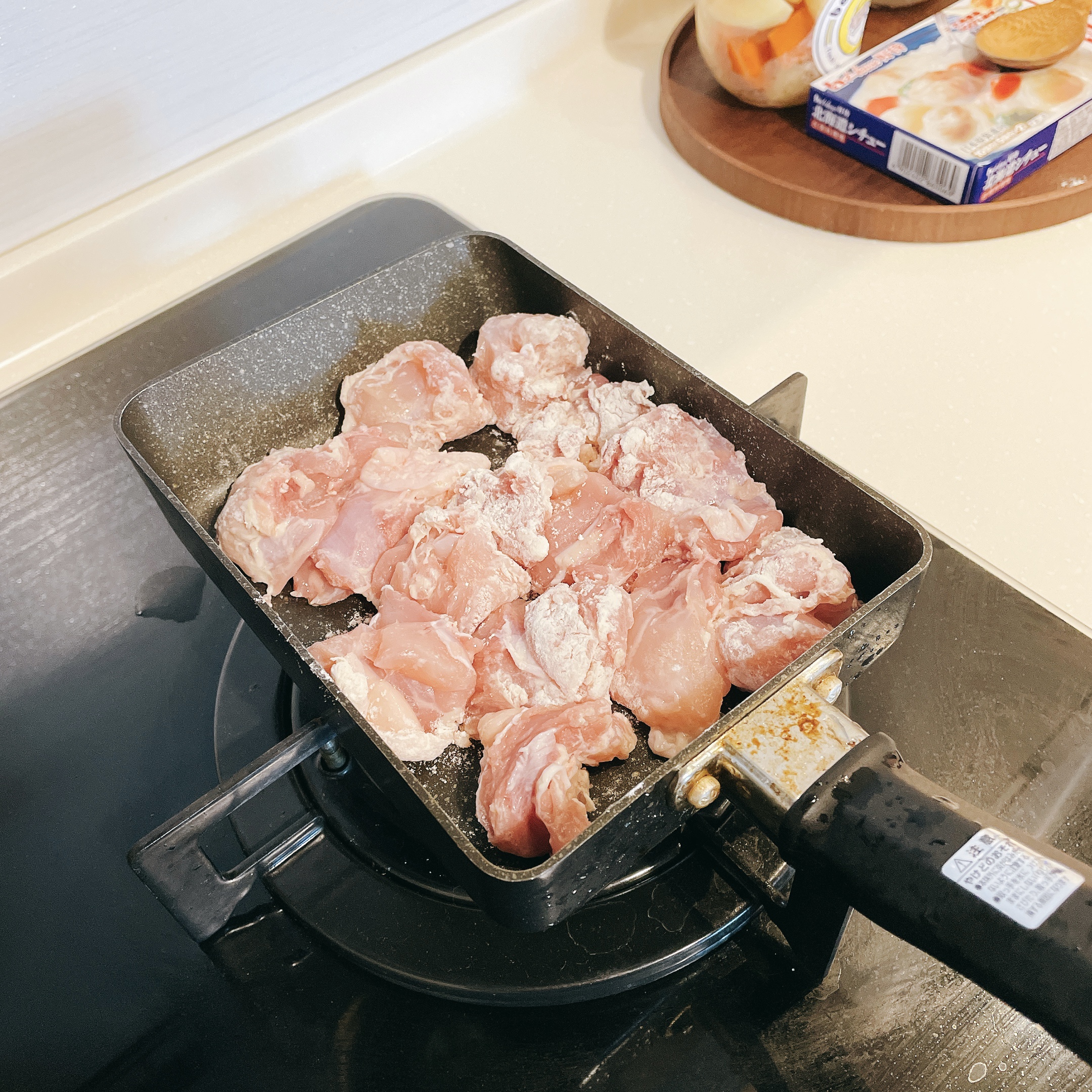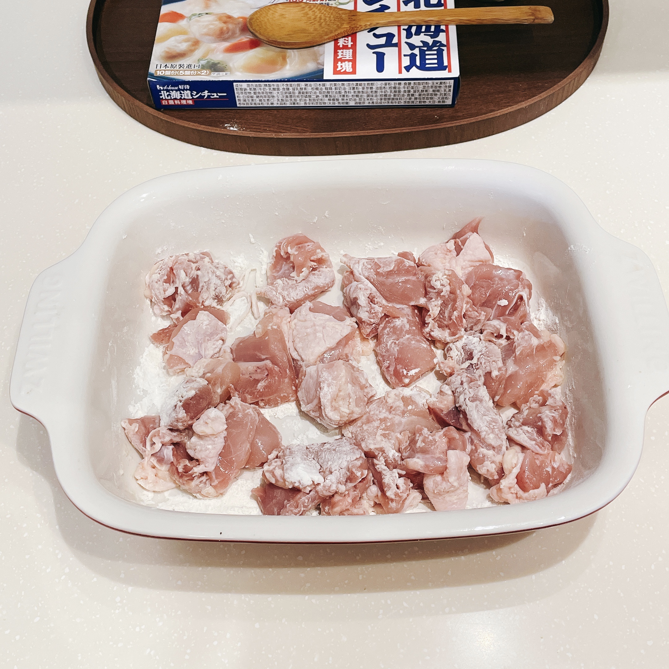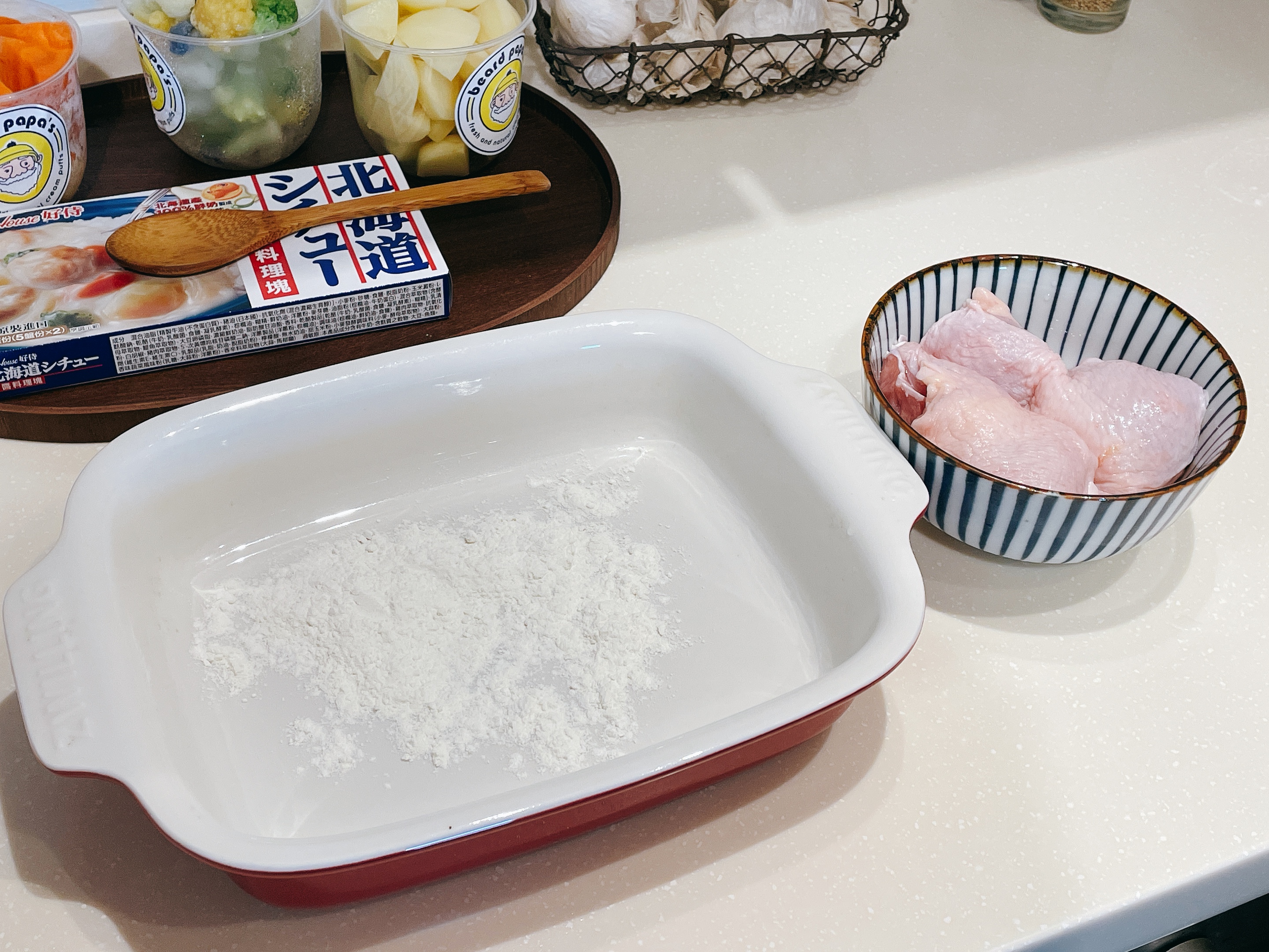 雞肉裹上麵粉增加口感,不要加入太多白醬,用牛奶/鮮奶油煮出濃稠滑順感,吃起來的味道更高級喔!