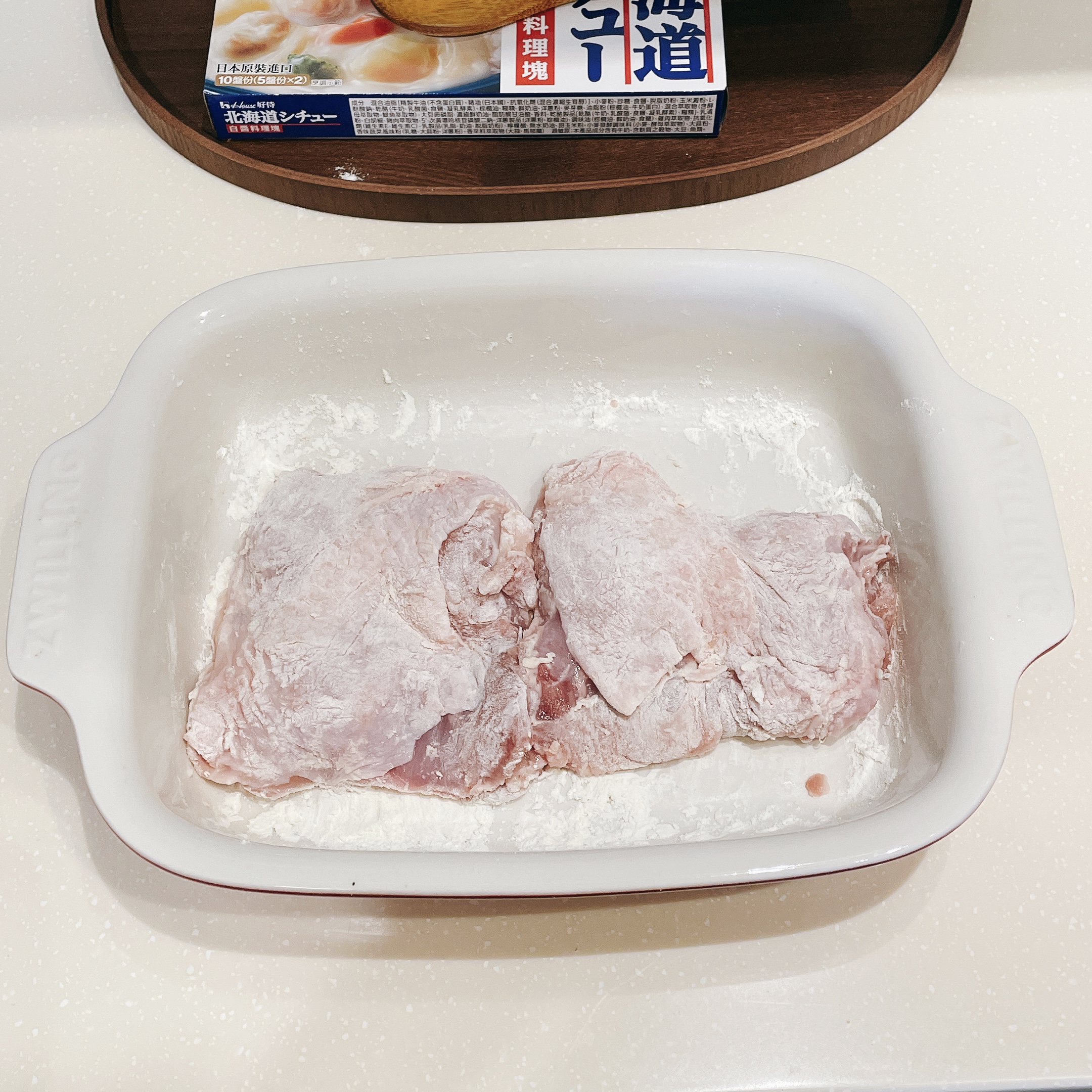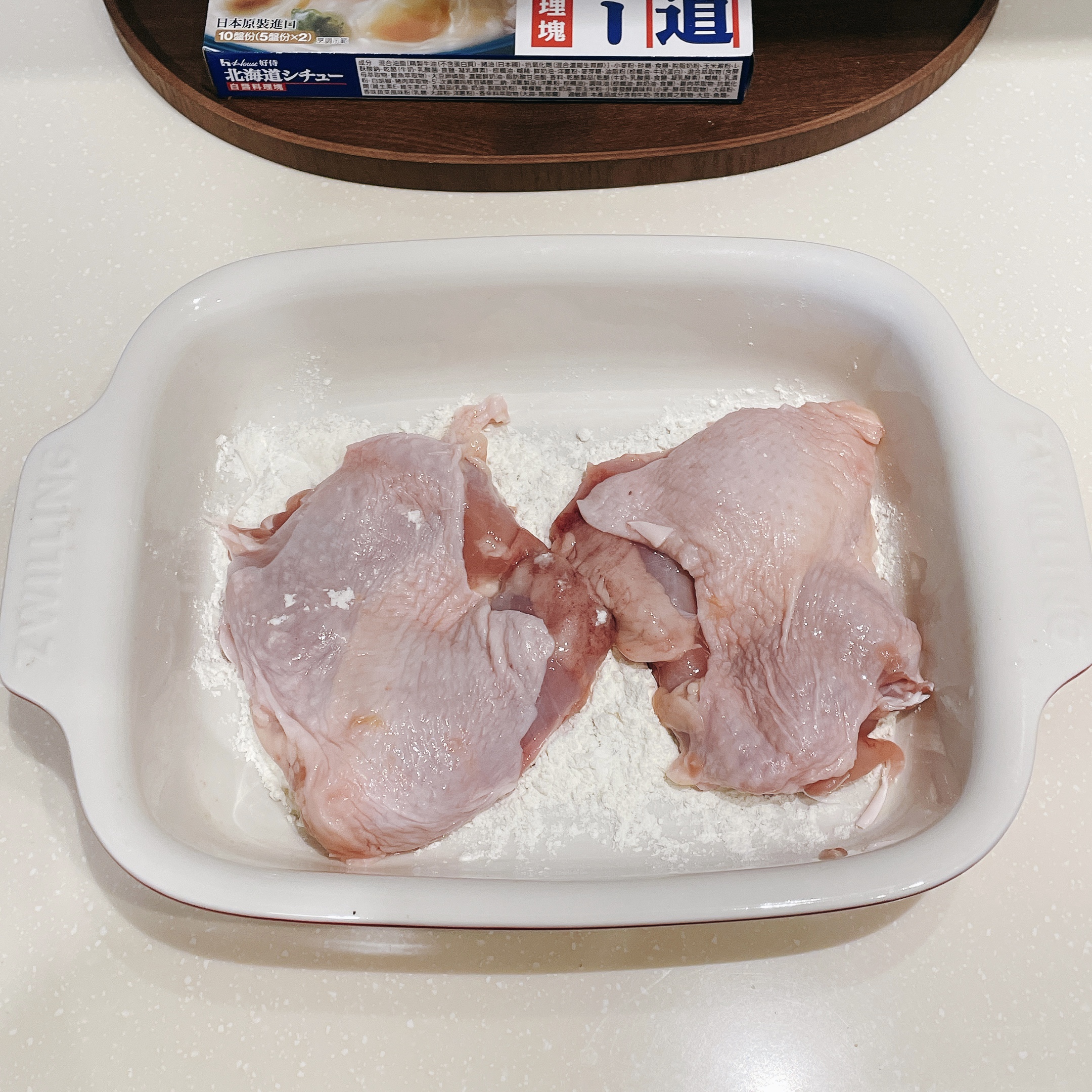 準備一個有深度的容器(這邊以陶瓷烤盤示範),撒上中筋麵粉(100g)並將沖洗擦乾後的雞腿排(400g)雙面沾滿均勻裹上麵粉,