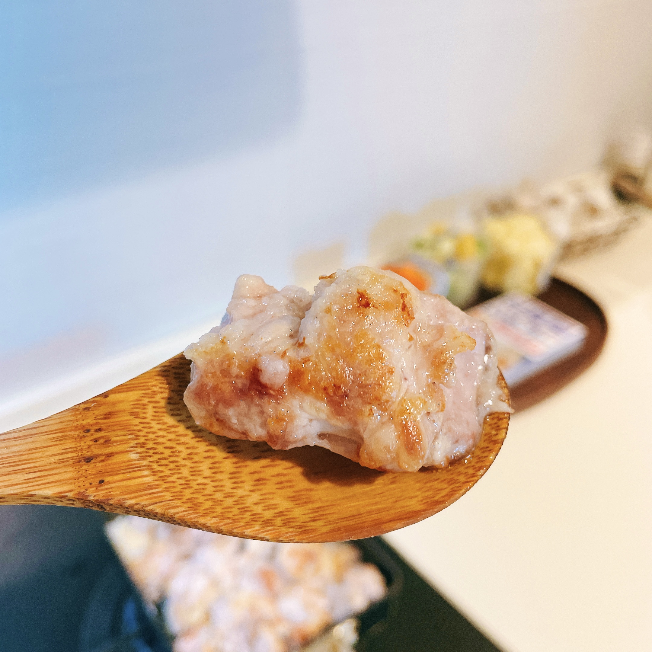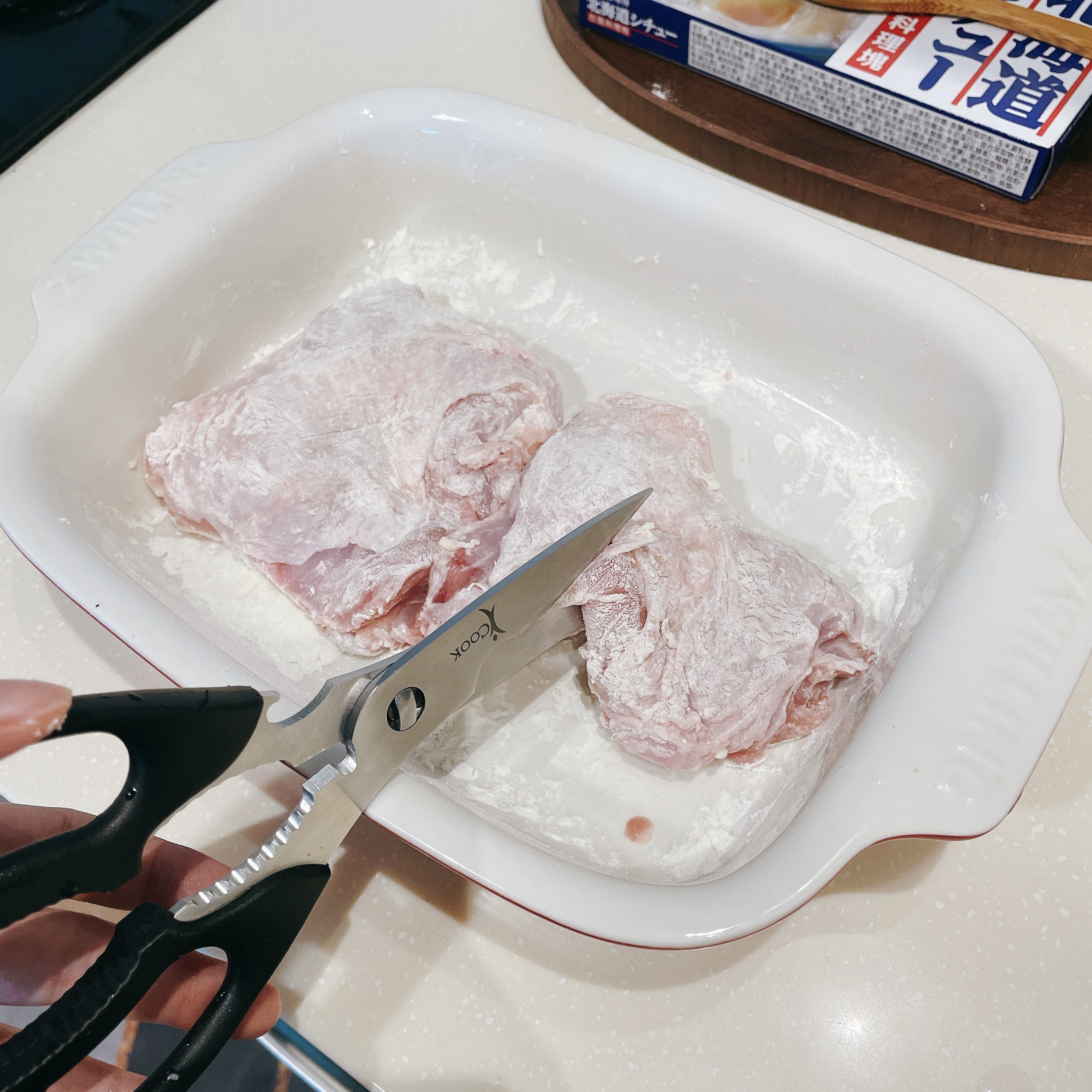 用食物剪刀將雞腿排剪成容易入口的小塊,