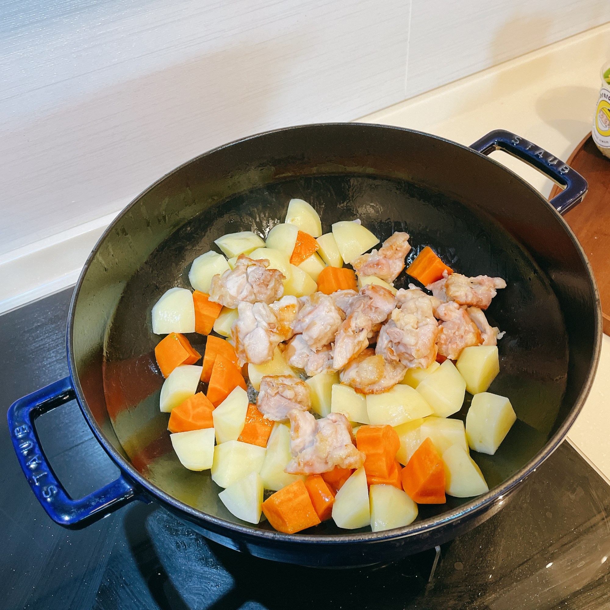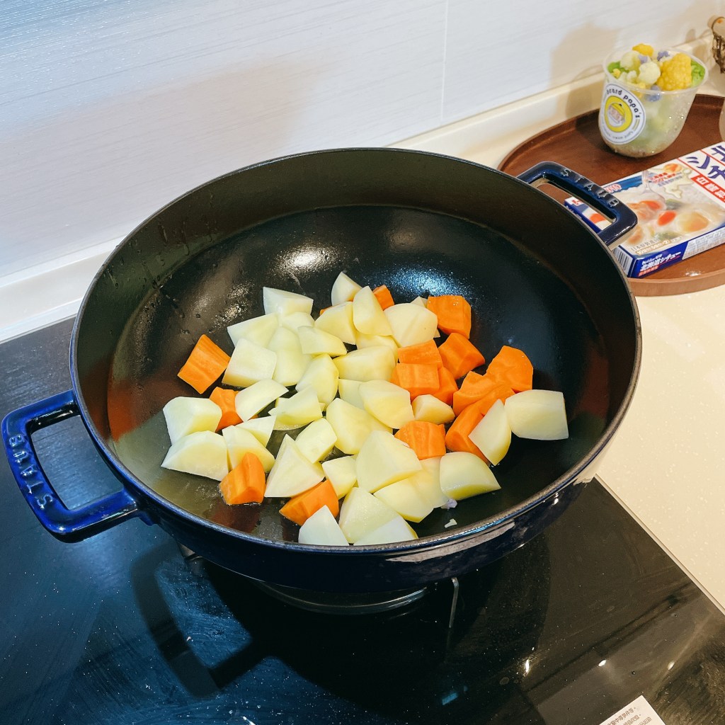 STAUB鑄鐵鍋中加一點橄欖油熱鍋,將去除土味的紅蘿蔔(150g)、馬鈴薯切塊(400g)加入鑄鐵鍋中拌炒至油亮,