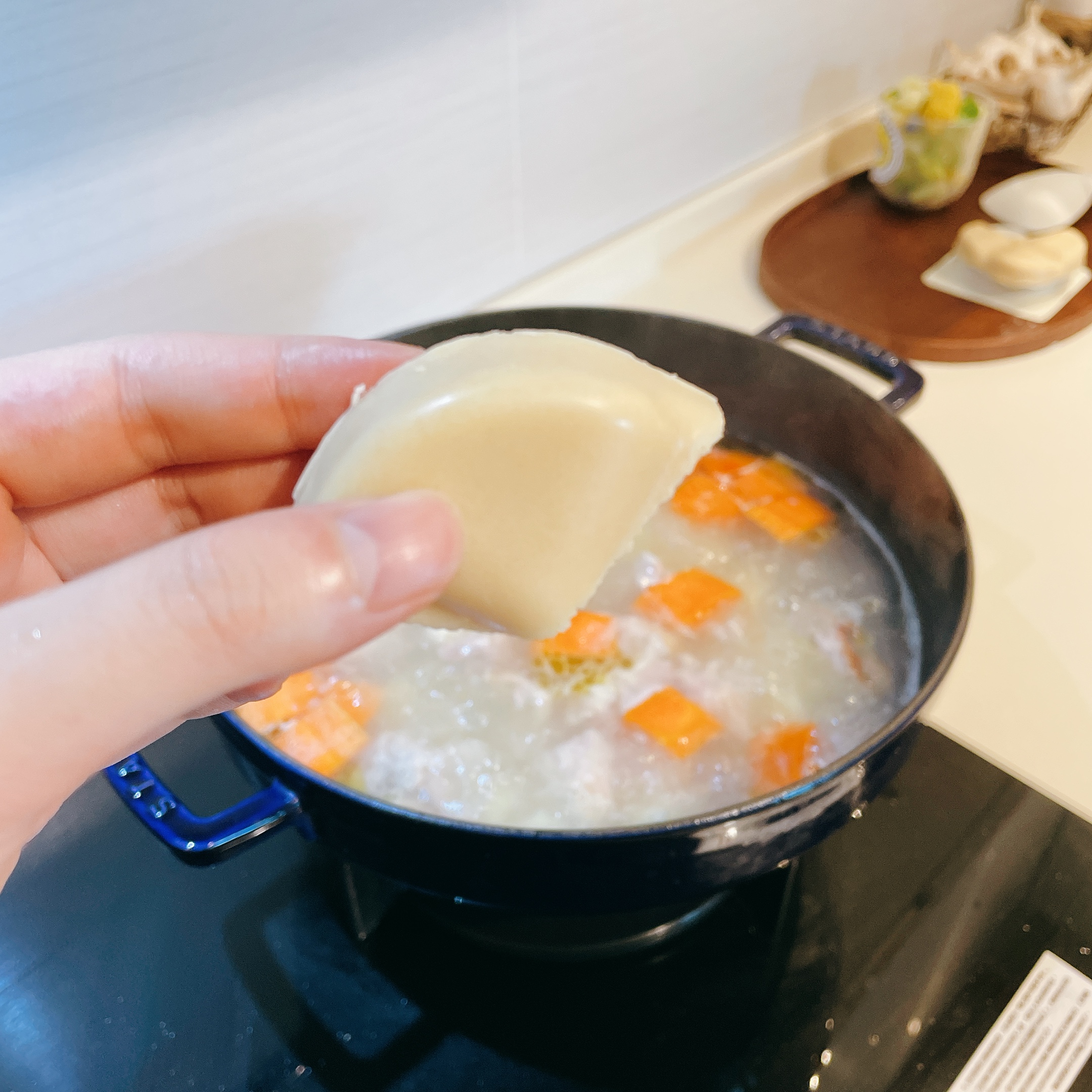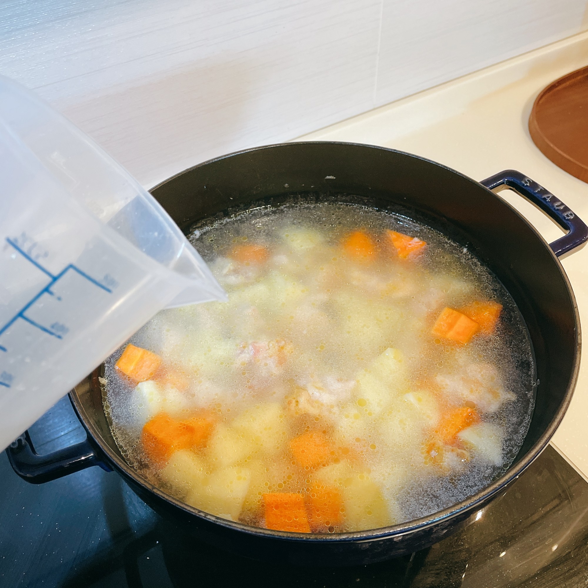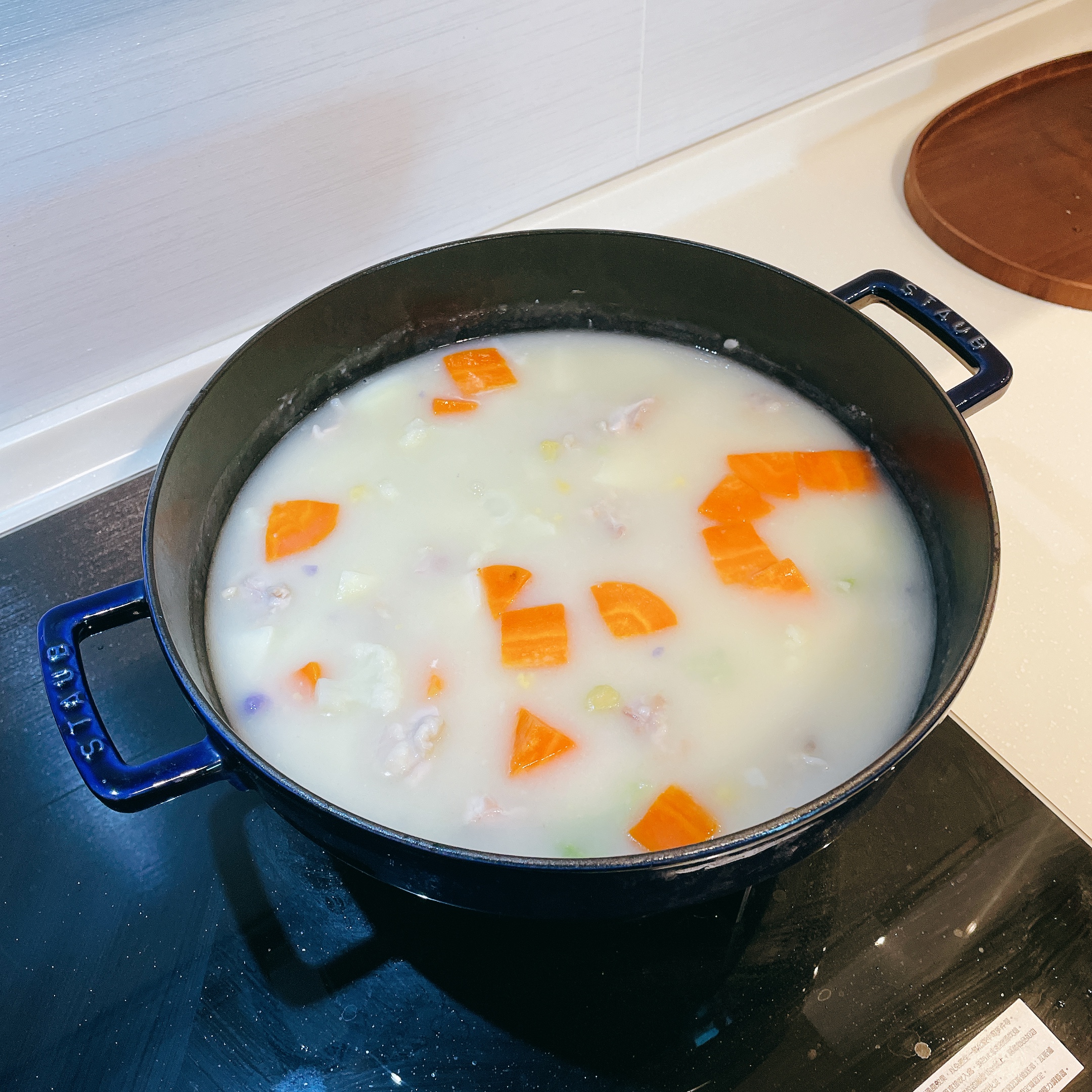 煮滾後將House好侍「北海道白醬料理塊」 (1塊)用手掰成4小塊,加入鑄鐵鍋攪拌融化繼續燉煮,