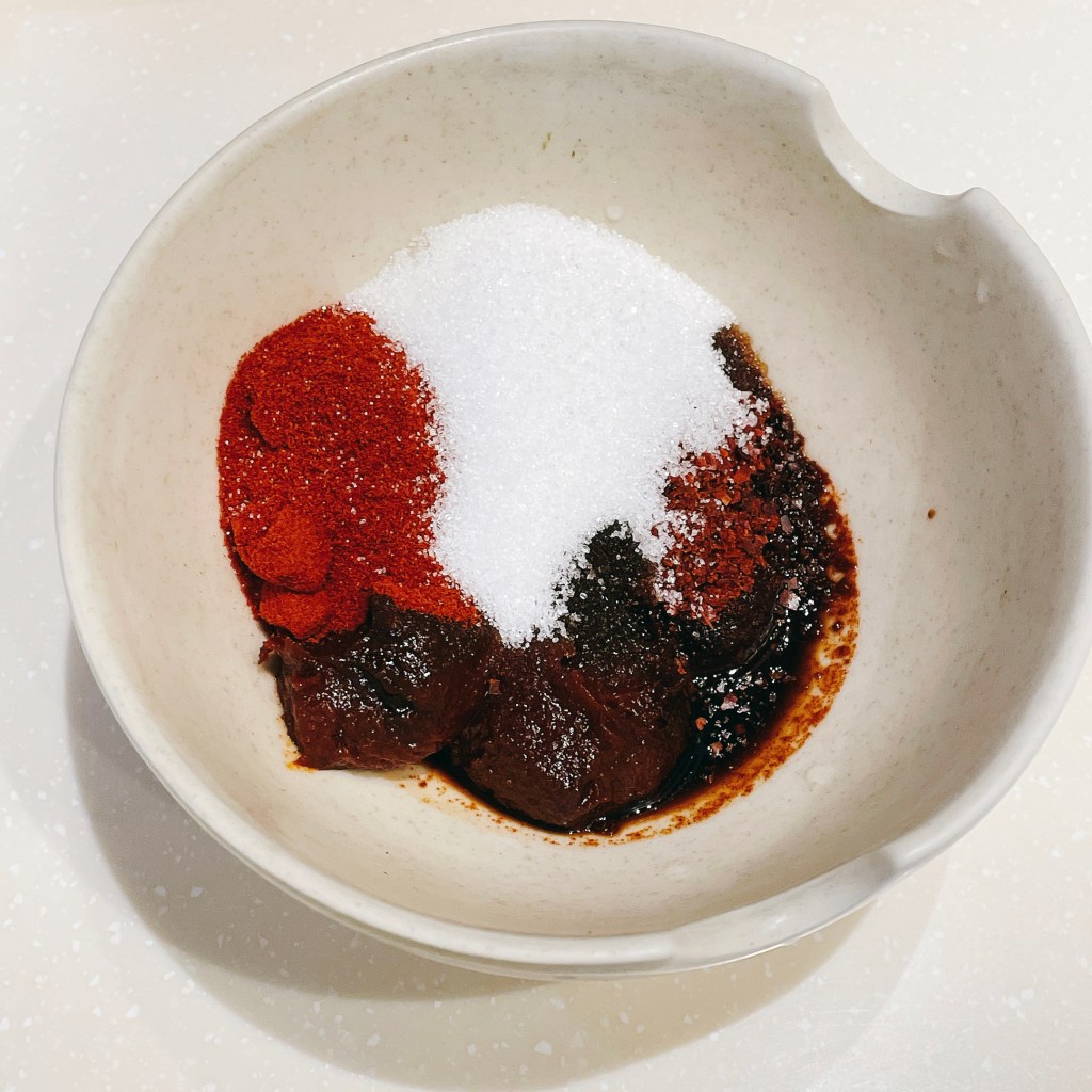 將韓國辣椒醬( 40g)、番茄醬( 1大匙)、醬油 (25ml)、細辣椒粉 (20g)、粗辣椒粉( 10g)、砂糖( 30g)倒入碗裡均勻攪拌,備用