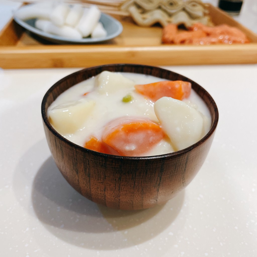 擁有乾煎雞腿、濃郁馬鈴薯、紅蘿蔔和花椰菜的甜膩奶油燉菜最適合加入辣呼呼的韓式辣炒年糕升級調整為漂亮又微辣的小朋友口味rosé玫瑰醬。