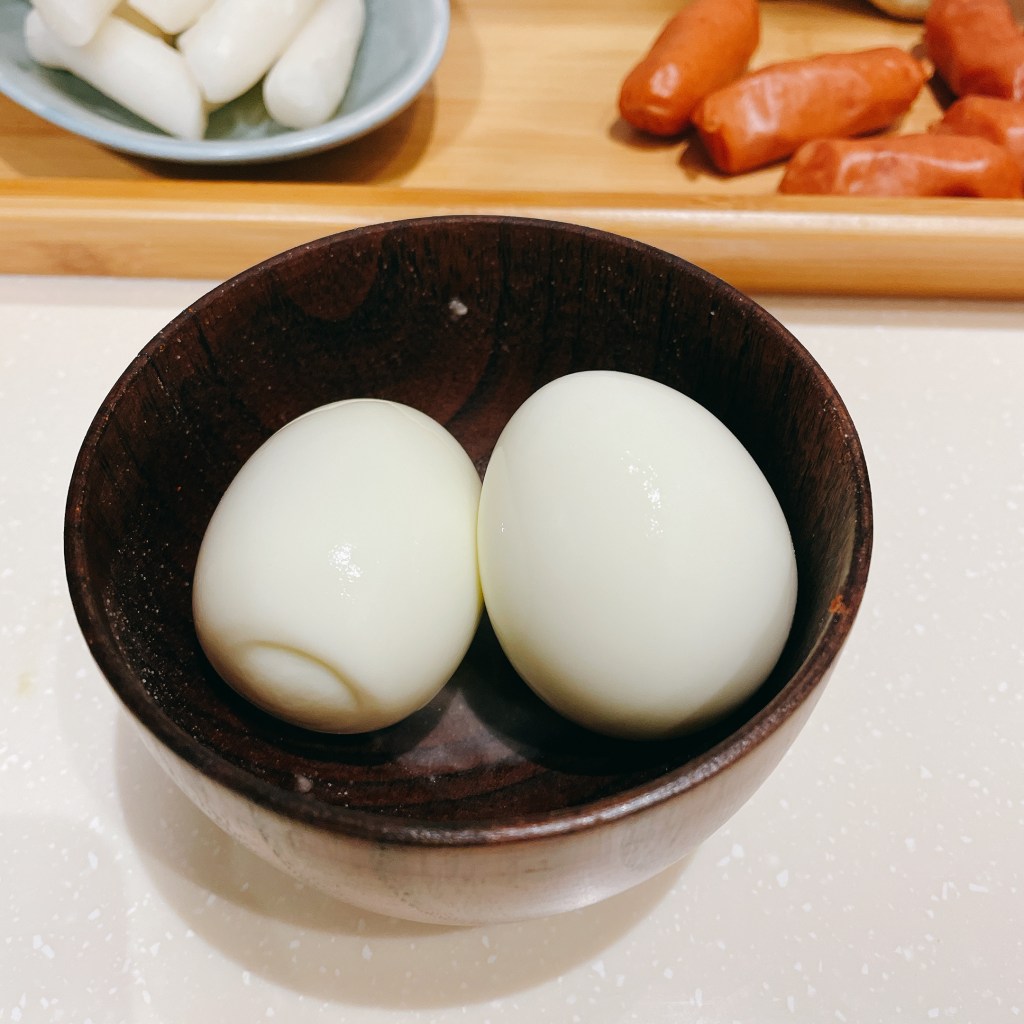 將廚房紙巾沾濕包覆生雞蛋(2顆)並在電鍋外鍋加入水(100ml)蒸熟後,在桌面上用手邊嚕邊壓雞蛋,就能快速完整剝掉蛋殼,放置一旁備用,就能開始製作炒年糕了。