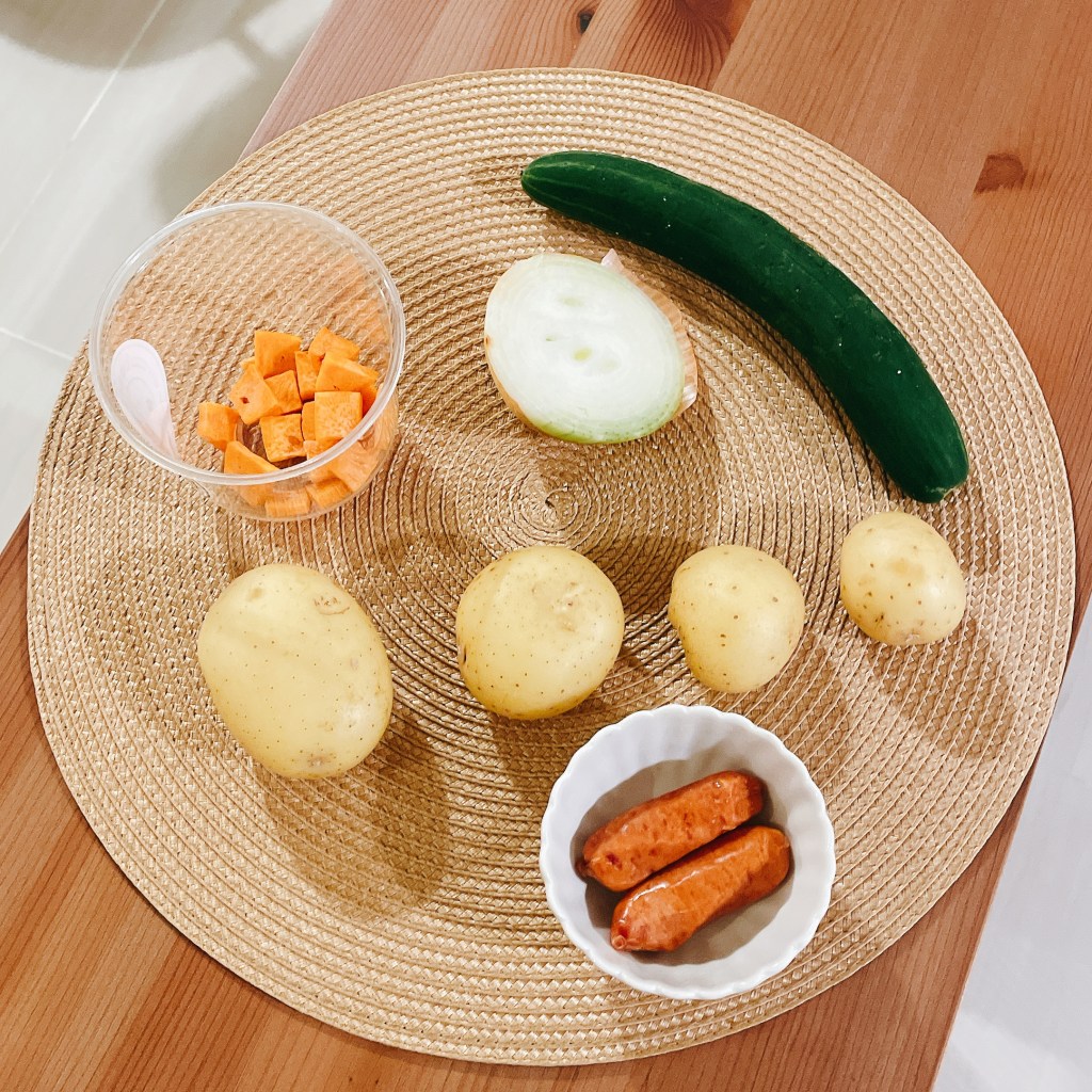 小黃瓜(半根)洗淨後切成薄片、洋蔥(10g)切碎後放入冰水中去除刺激辣味,等馬鈴薯蒸好就能愜意製作馬鈴薯沙拉囉!