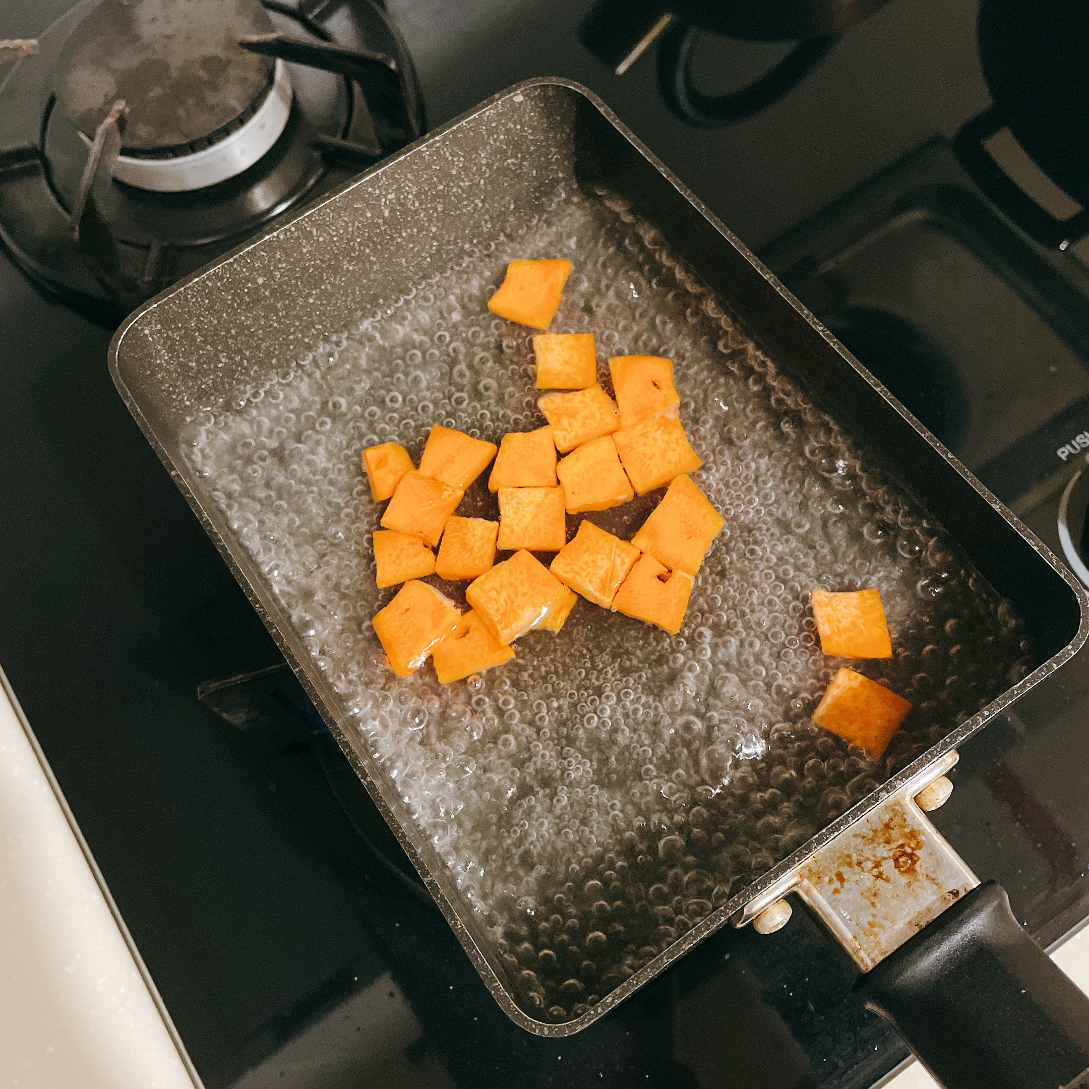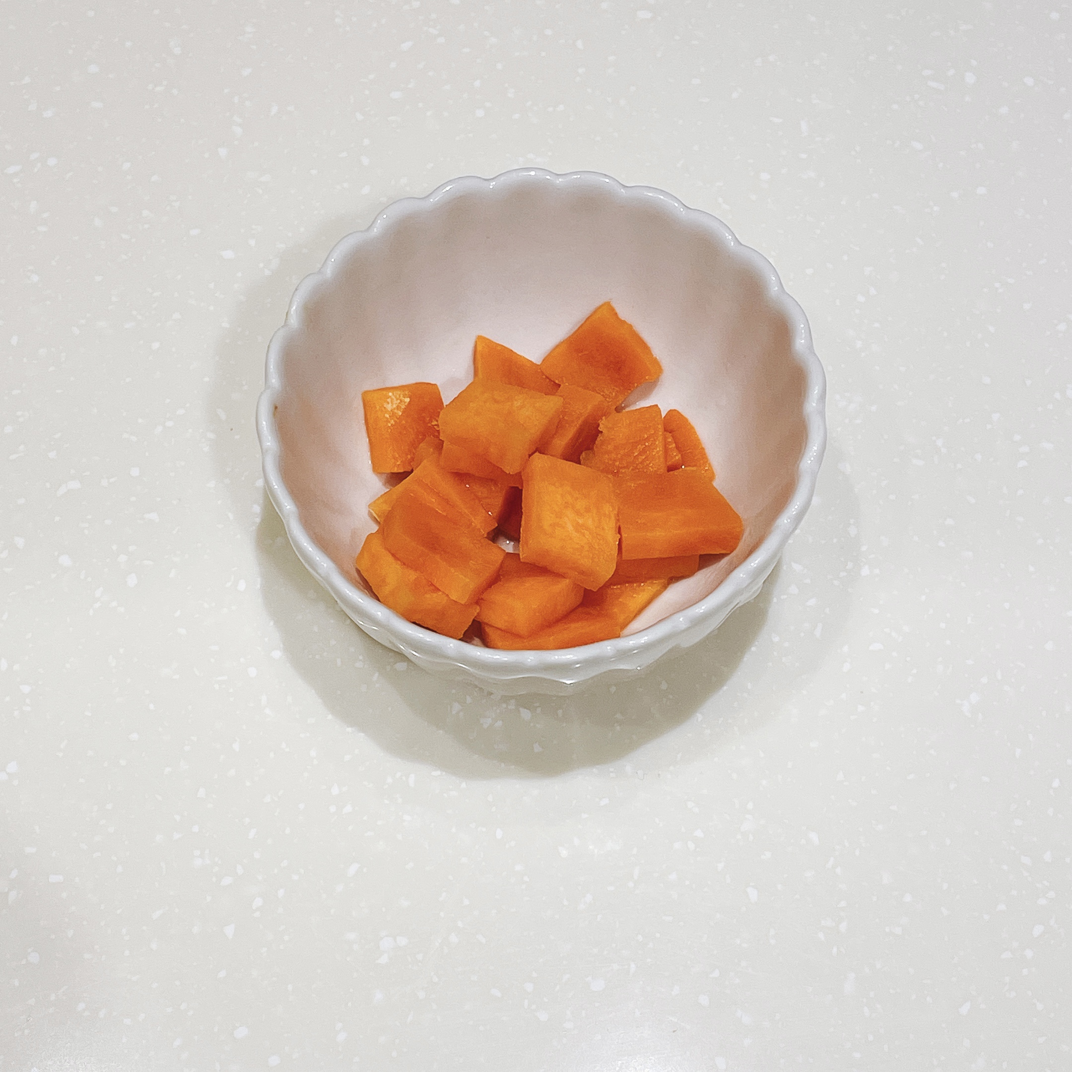 接著將紅蘿蔔(50g)切片後加鹽巴(1茶匙)煮熟去除紅蘿蔔特有土味,