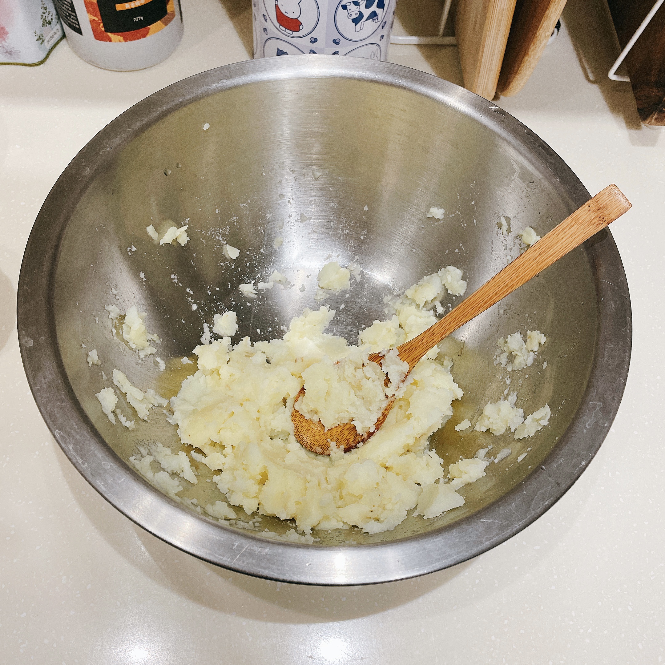 用木湯匙將熟透的馬鈴薯壓碎,趁還熱熱的時候放入洋蔥碎(10g)攪拌均勻,