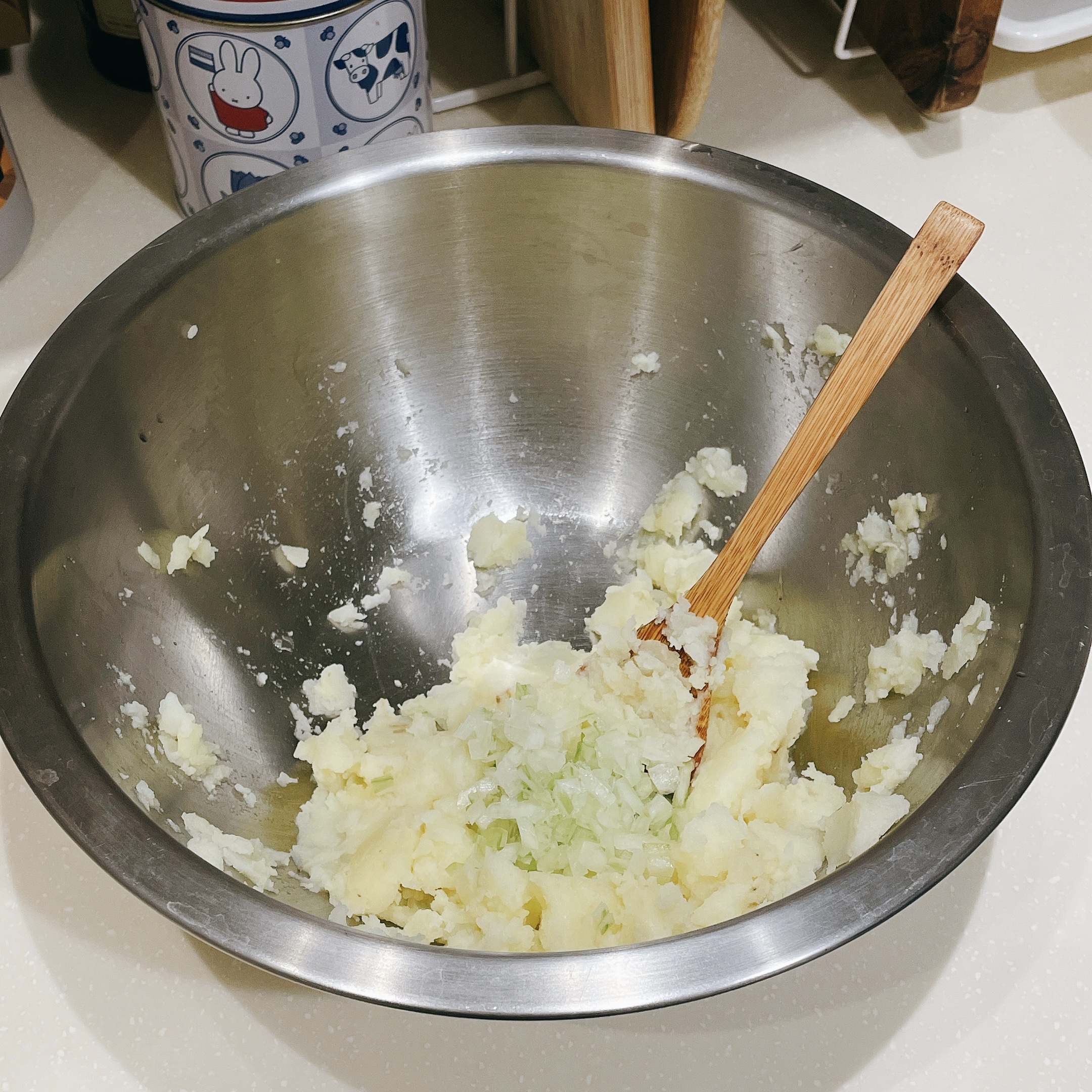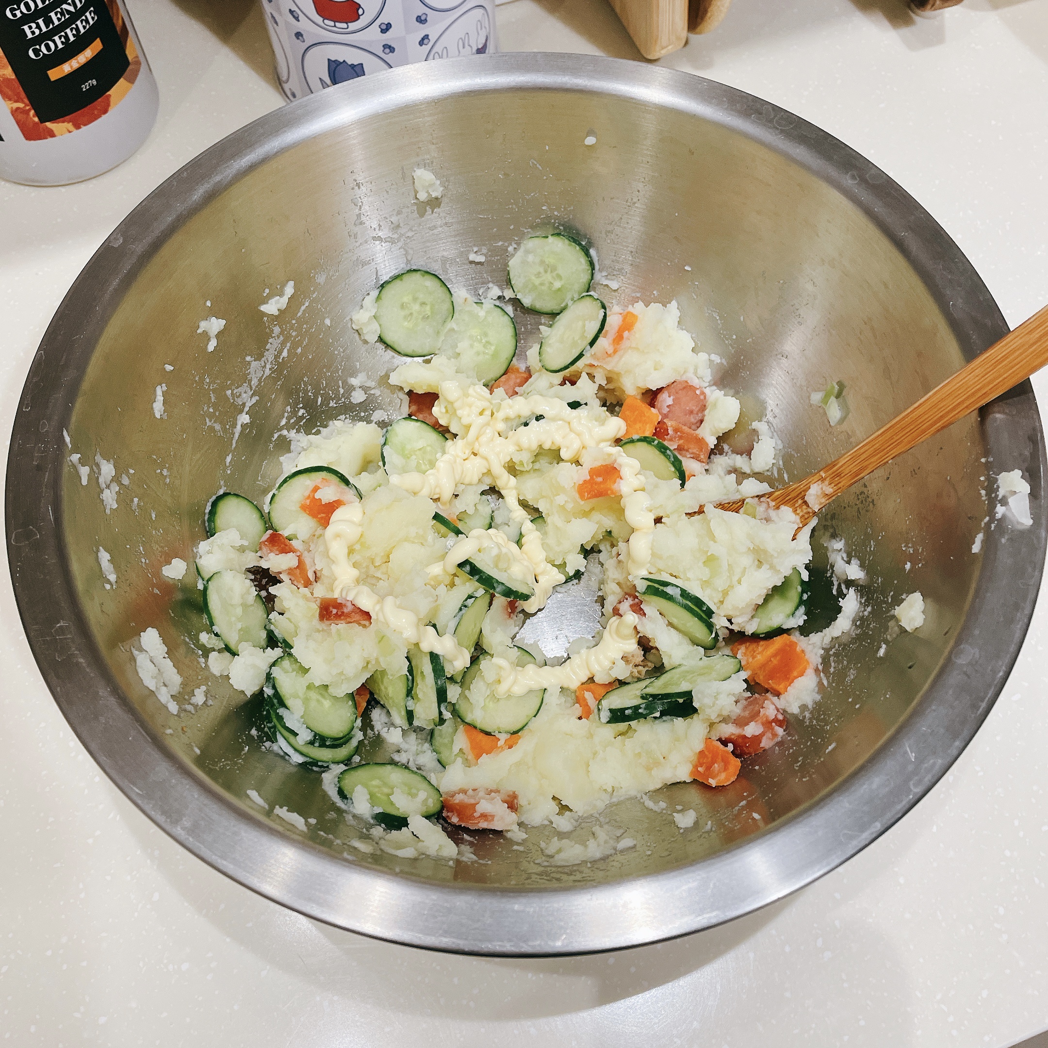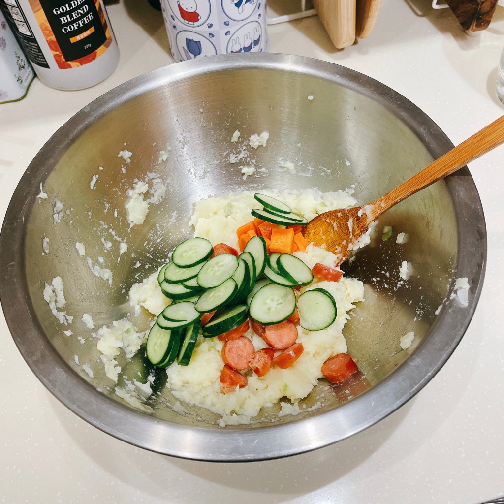 馬鈴薯去皮壓碎、美乃滋涼了再加