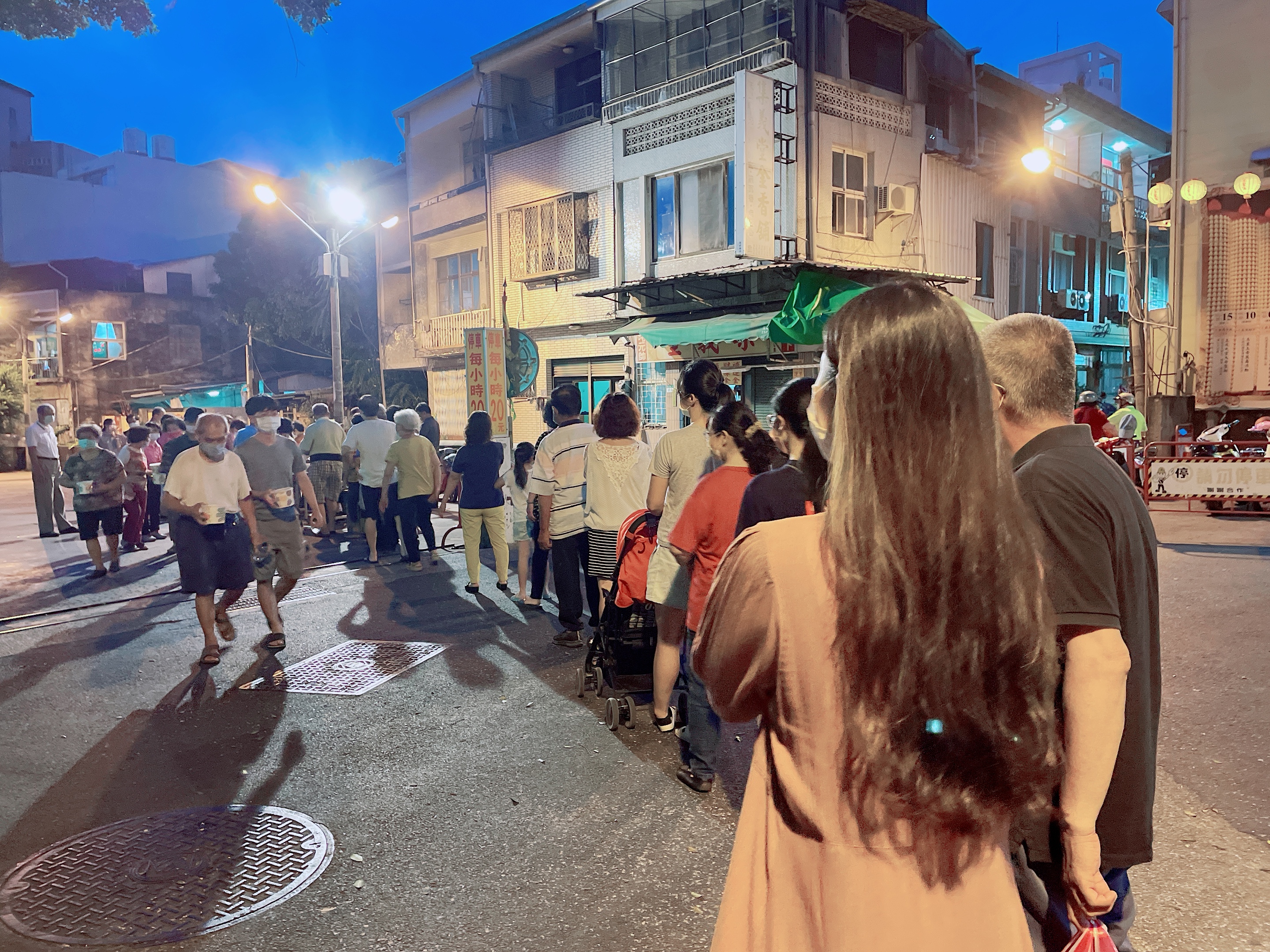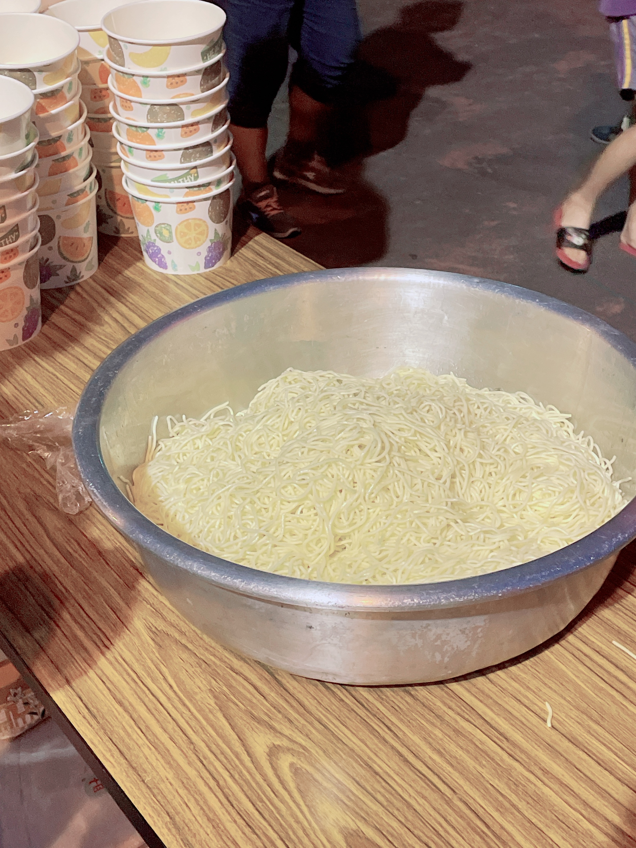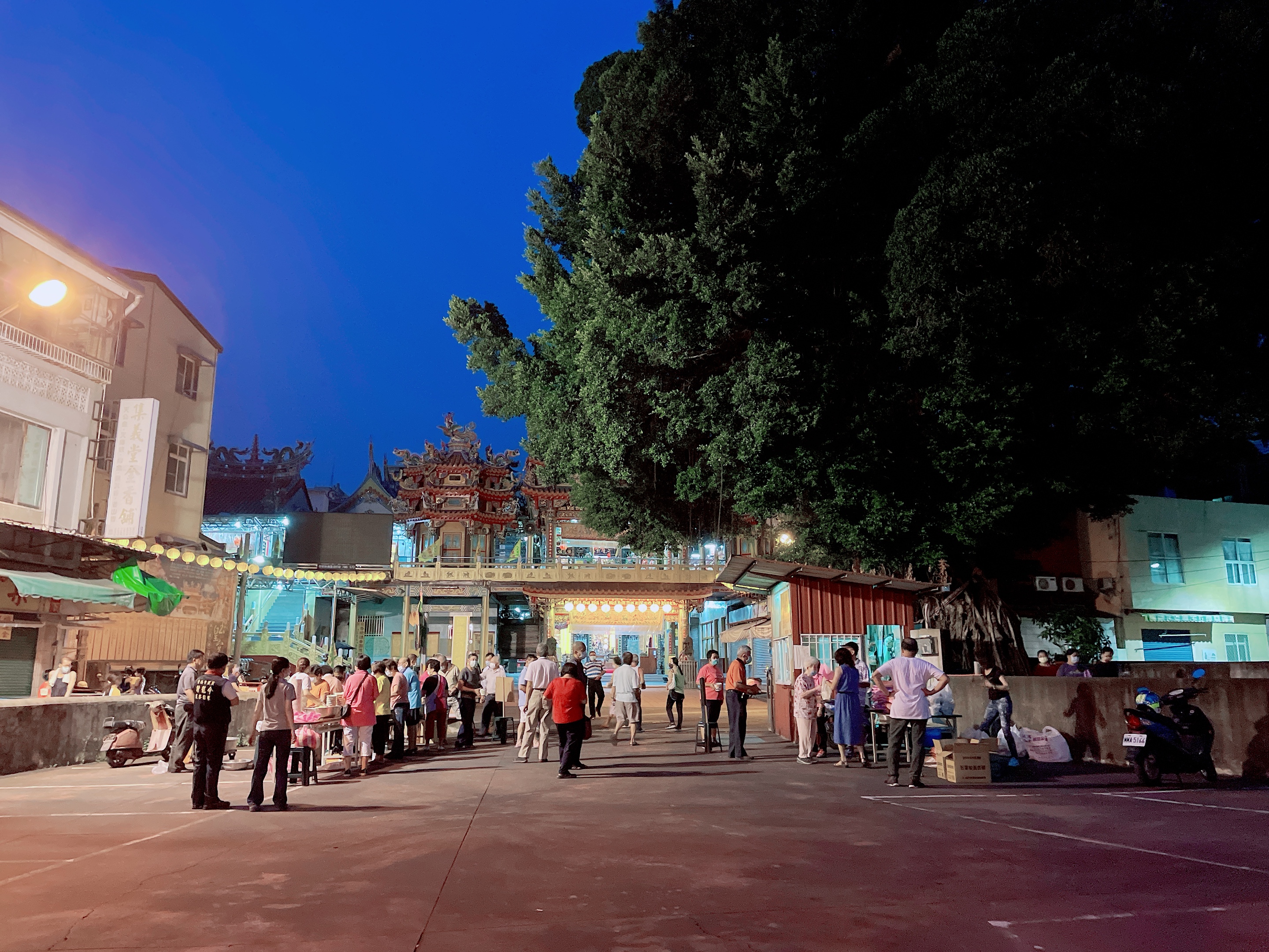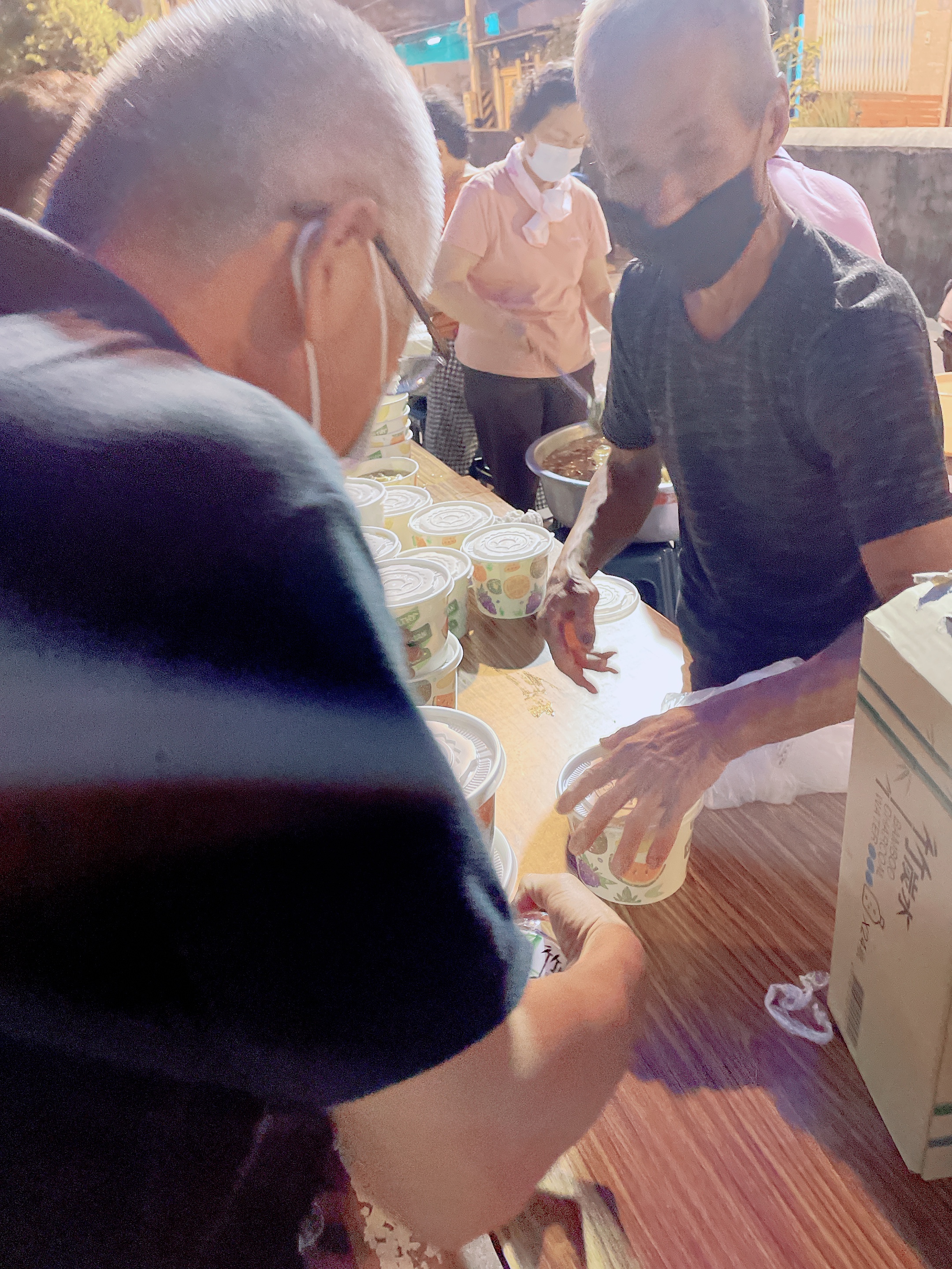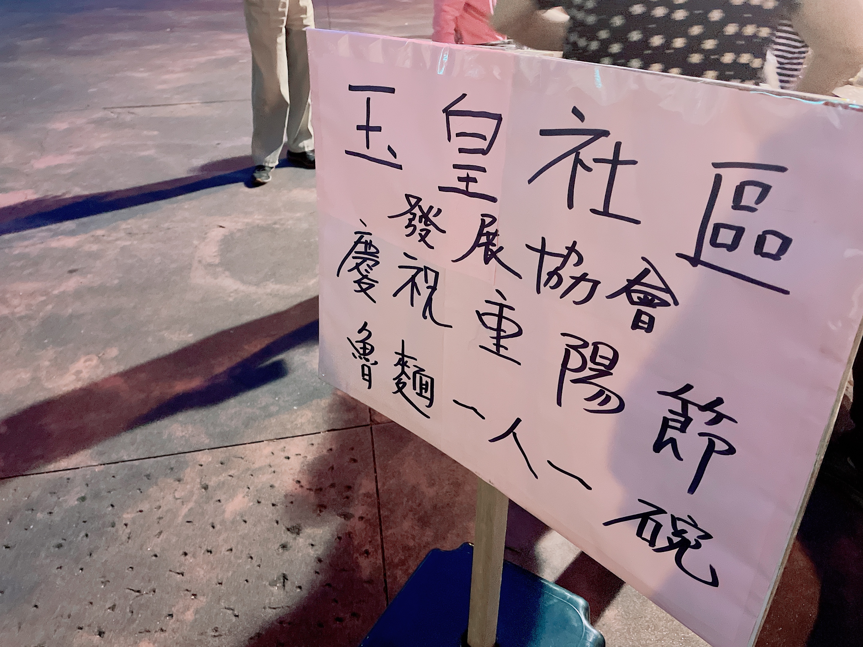 偌大的廟前廣場分為兩區,一側為民眾可自行排隊領取魯麵的隊伍,另一側身為社區里民會員(例如:米飛公公&米飛婆婆)可以直接領取預定的魯麵以及重陽賀禮。