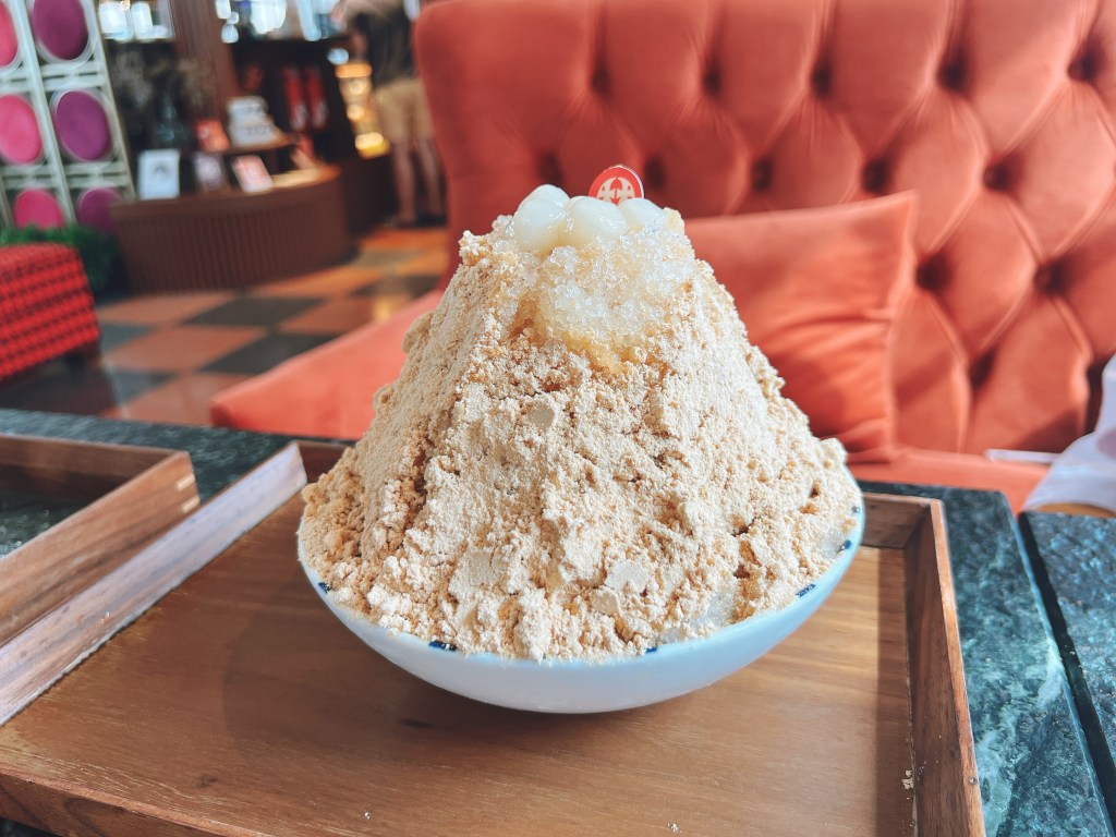 麵茶搭配剉冰和日本黃豆粉相比毫不遜色,白湯圓Q彈有嚼勁,微甜的黑糖漿和蜜豆餡,是具有台日混血意味的夏日甜品。