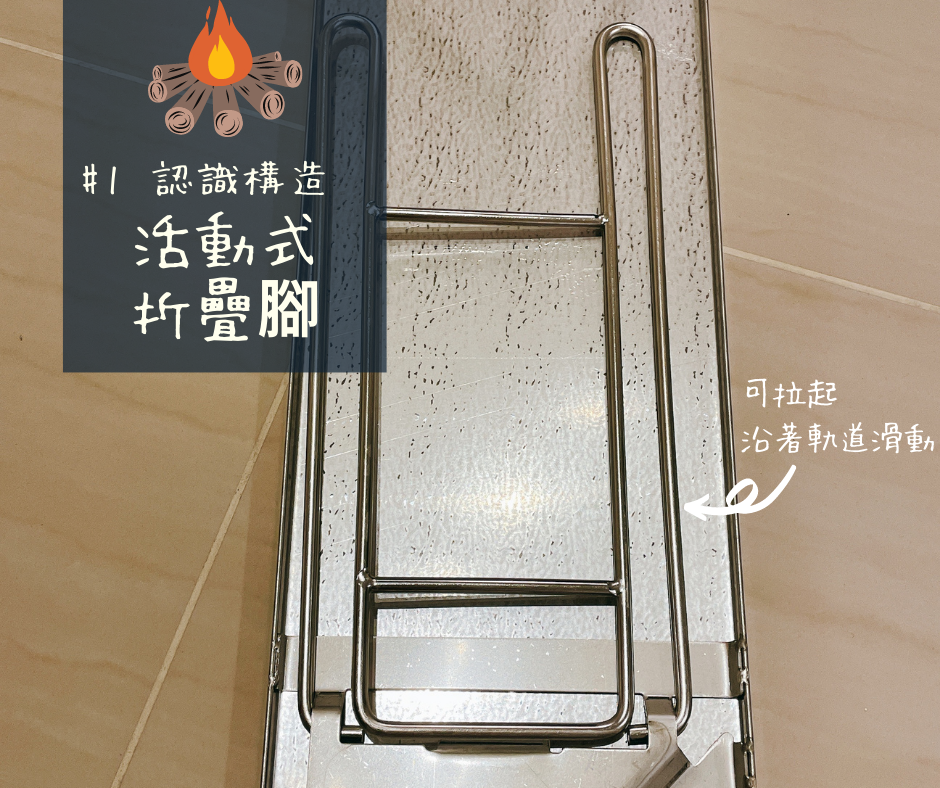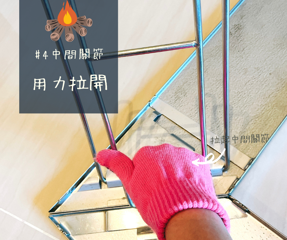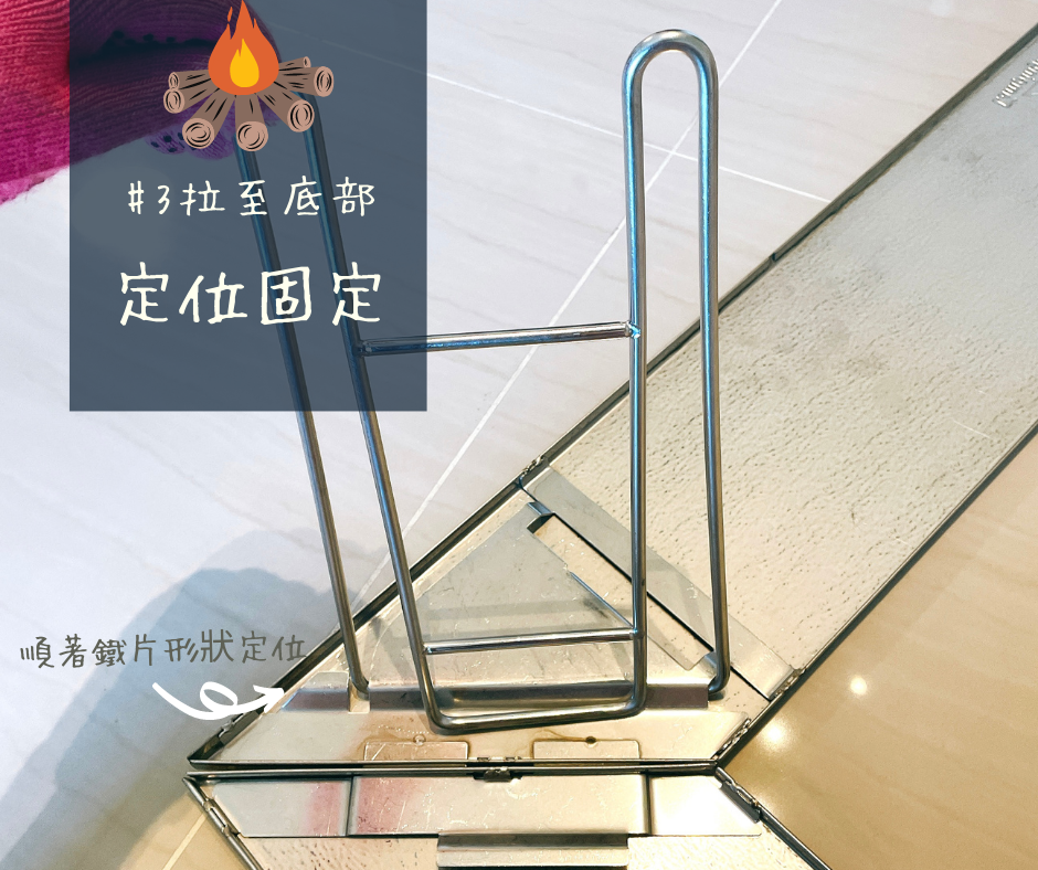 將活動式桌腳立起來,左側關節沿著三角形鐵片軌道滑動至底部後,再將中間關節非常用力拉開,(可用腳踩著桌板協助施力)向後拉套住固定,重複以上動作將四個桌腳立起來(詳細如下圖)