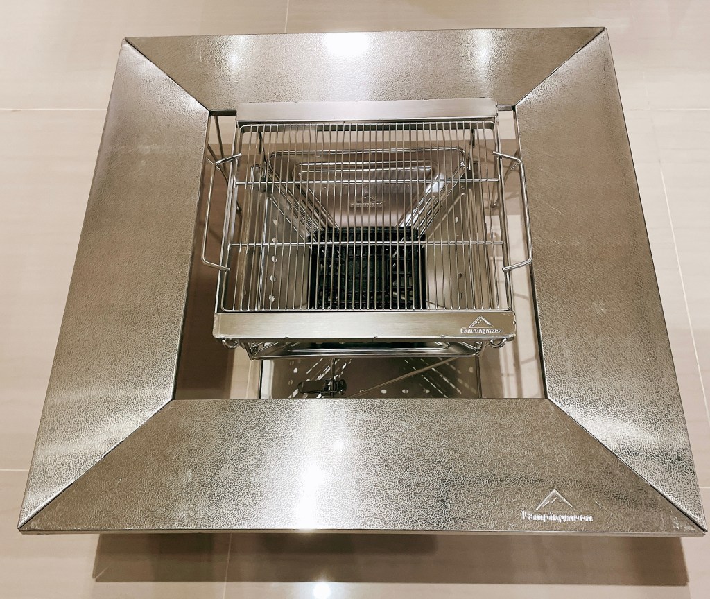 放上層板的圍爐桌可以在上面放卡式爐直接烹煮食物;若要使用焚火爐直火烤肉的朋友可以不裝層板,直接在中間放上焚火爐和防火布即可。