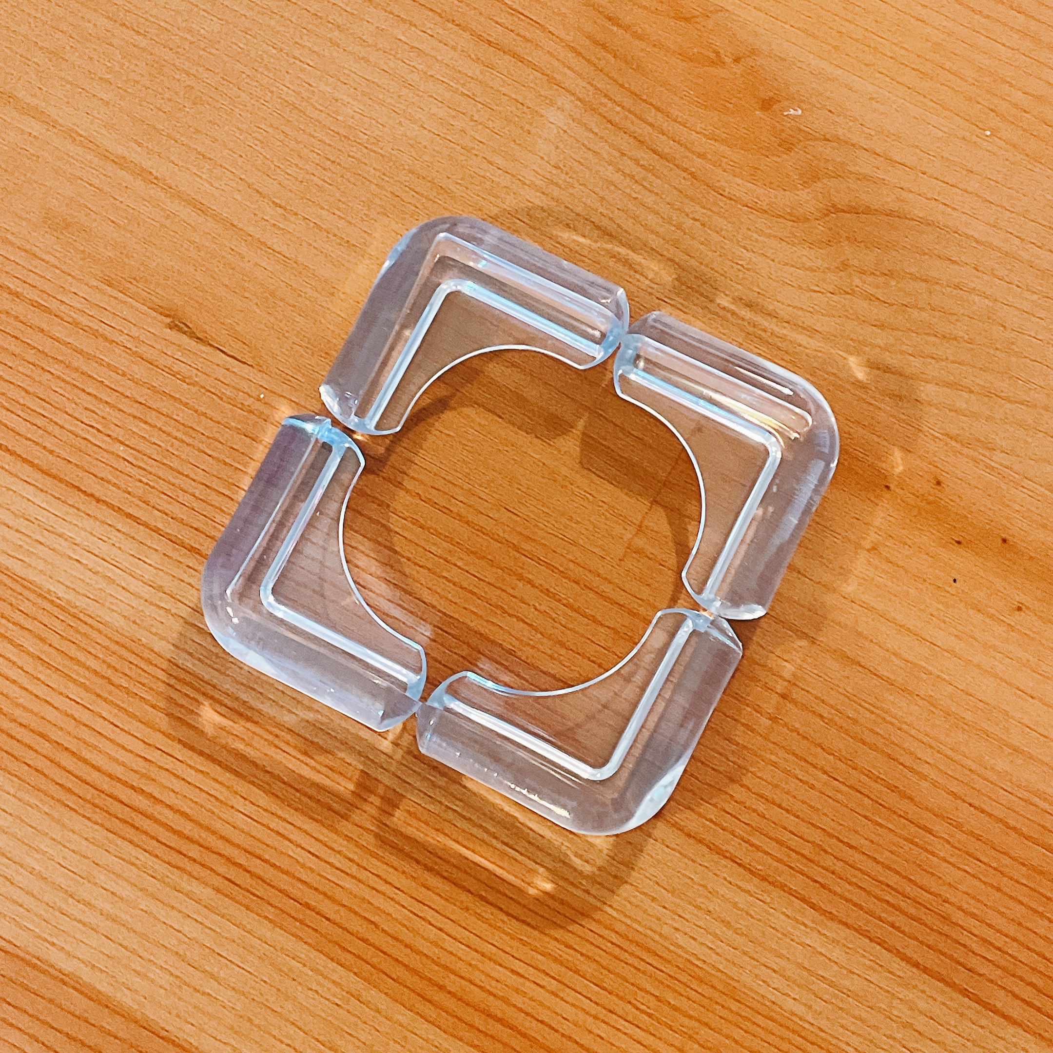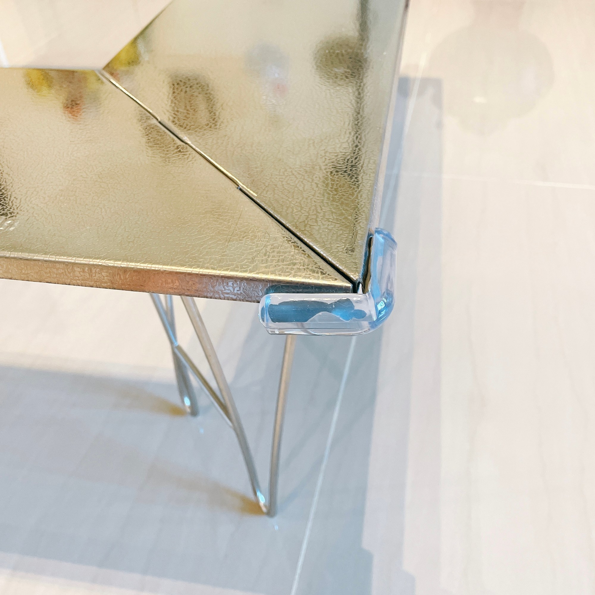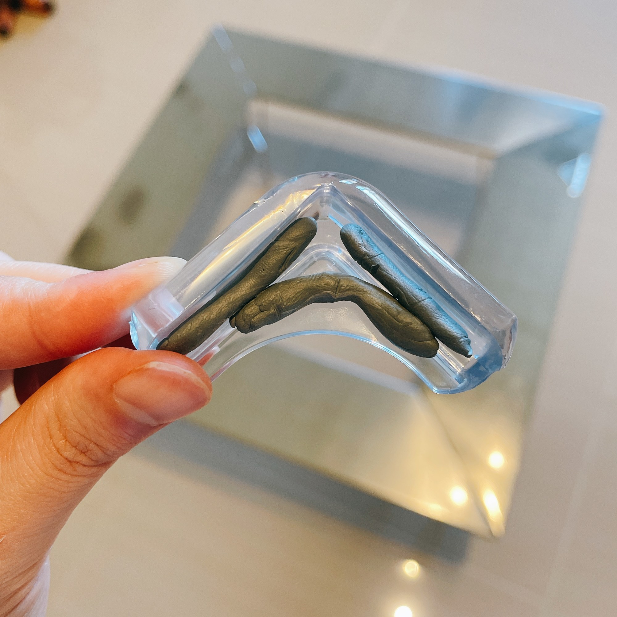 考量桌角防護需重複使用,因此建議在桌角側邊與底部放上長條工業黏土後,較寬的那面朝下(因銳利處在桌底接縫處)黏在CAMPINFMOON圍爐桌的四個桌角,這樣就萬無一失囉!