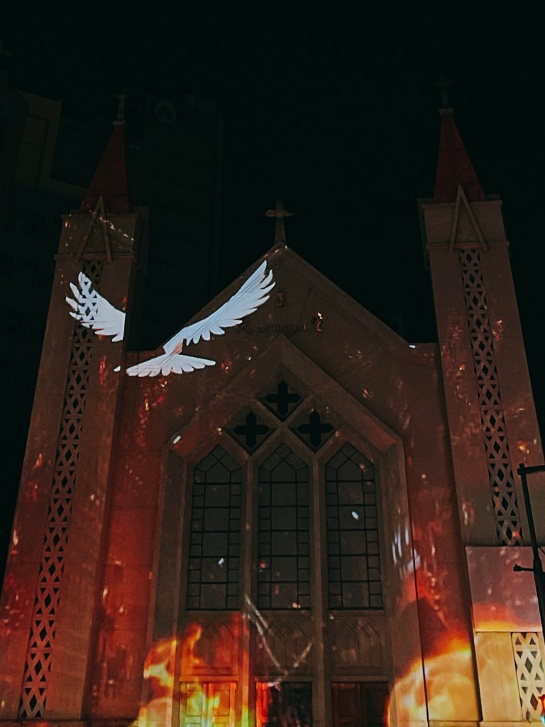 敘事軸線分為世間紛擾、北大教堂的誕生與信仰,藉由聲光效果引領觀看者共感,1951年歷經大時代動盪迫害逃往台灣的天主教神職人員,展開自由之翼在此重建宗教、藝術與生活。