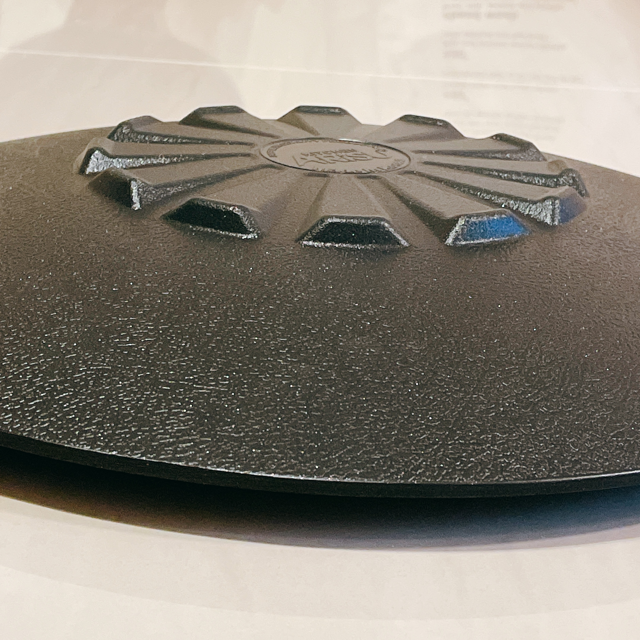 不過,ARISU鑄鋁圓型烤盤底部有一朵定海神針「小花」,凹凸雕花卡榫設計賦予手把式烤盤屹立不搖的底氣,也給米飛一帖定心丸消除焦慮。