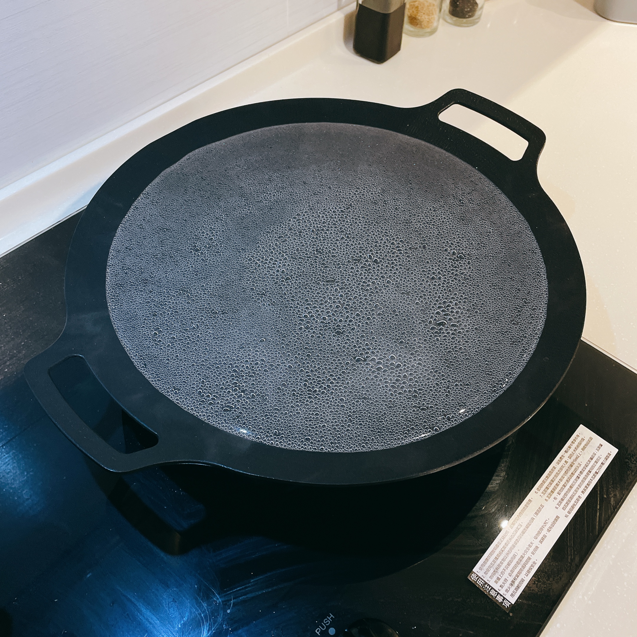將ARISU鑄鋁圓型烤盤架置在瓦斯爐上,倒入自來水8分滿,煮沸後將水倒掉擦乾,妥善保存在陰涼乾燥處即可。
