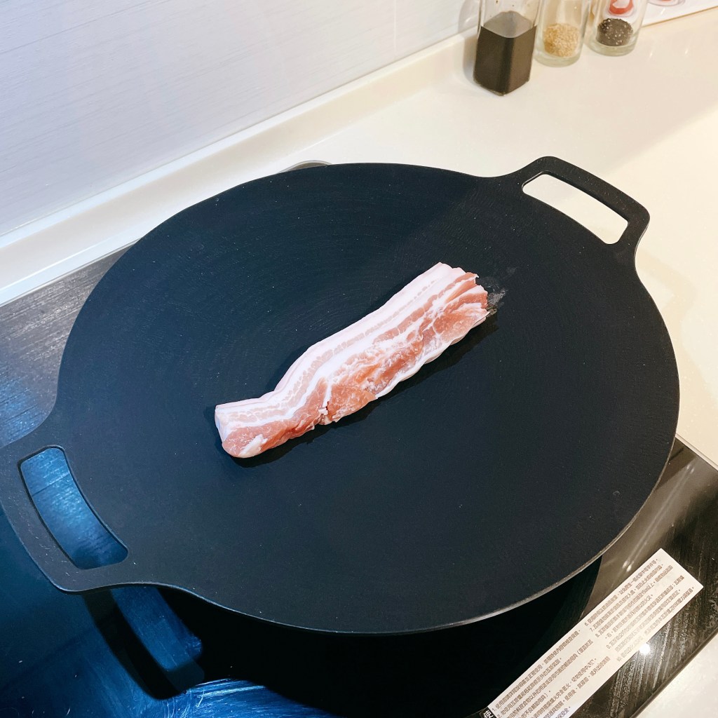 中間火力最強勁,因此豬五花烤到外表黃金色即可放到外圈,以免整鍋烤完過熟。