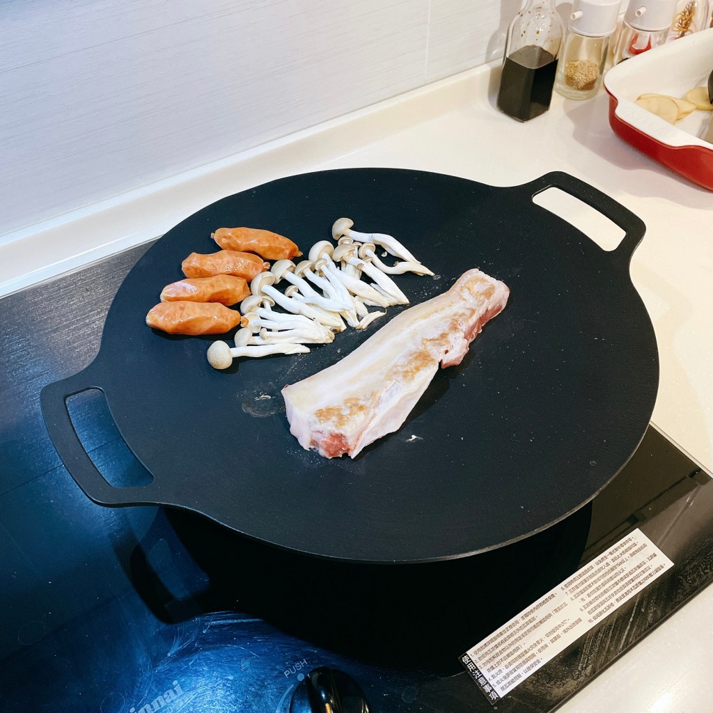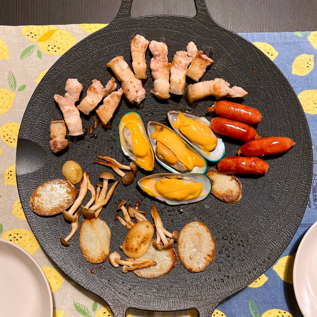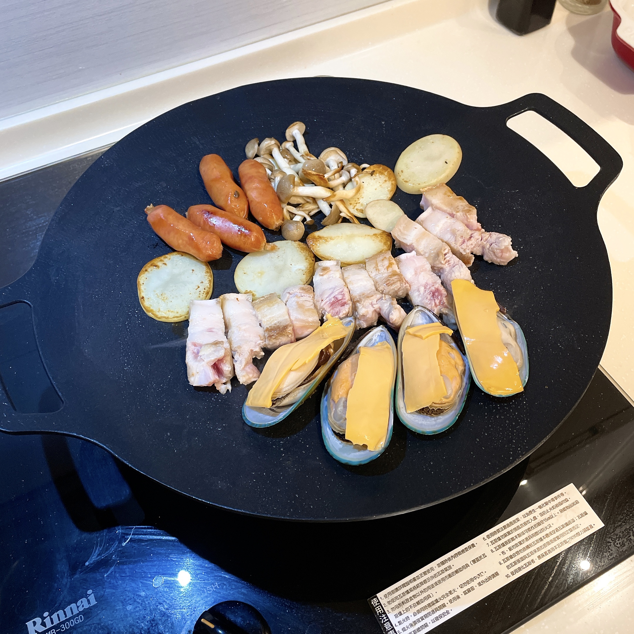 依序放入厚切豬五花(一條)、鴻禧菇(半顆)、德國小香腸(4根)開啟小火煎烤至豬五花流出豐富的油脂,將豬五花翻面後,在油脂處鋪上馬鈴薯片(1顆)並在外圈放上鋪好起司的帶殼淡菜(4個),烤到食材全熟就能熄火囉!