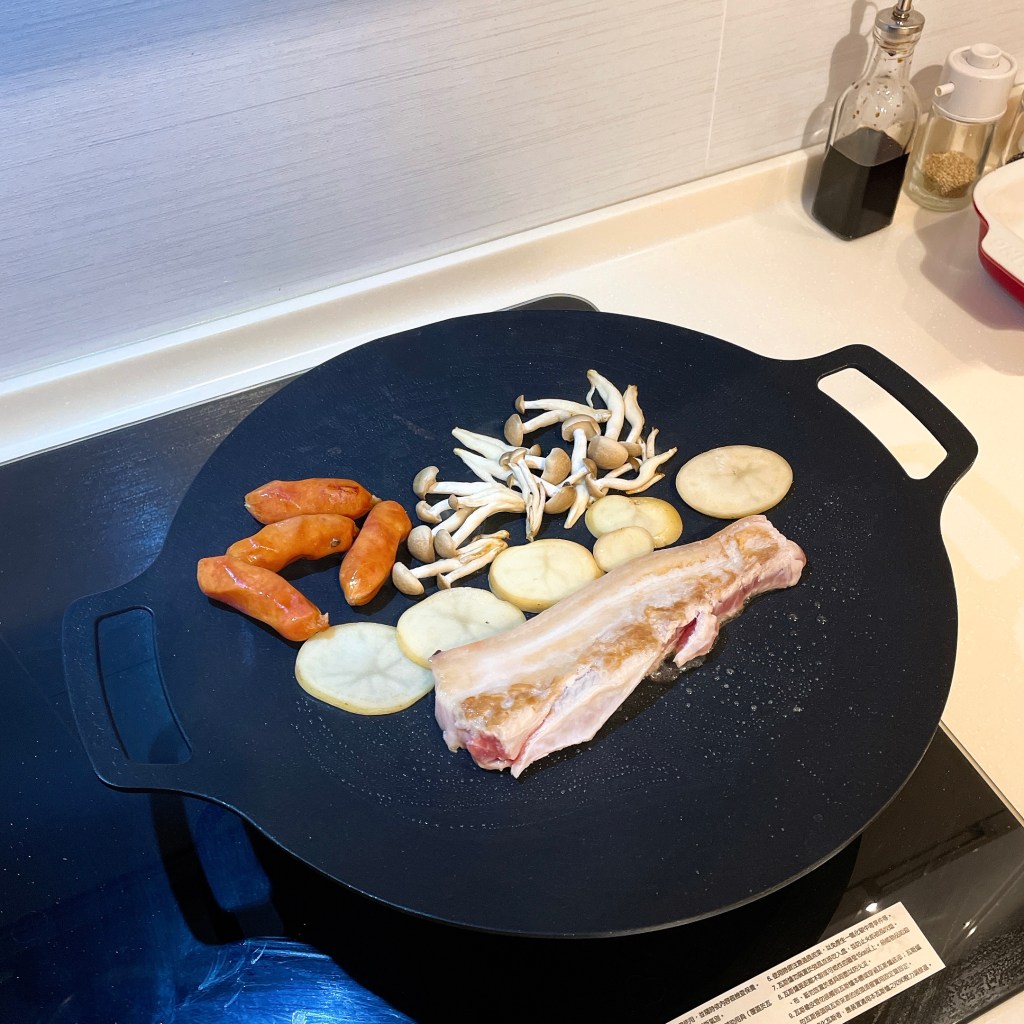 斬斷高腳架烤盤的營火幻想殘念後,米飛意外在網路上逛到這組韓國直寄ARISU(表面inoble不沾鍋無毒塗層)的鑄鋁圓形烤盤。