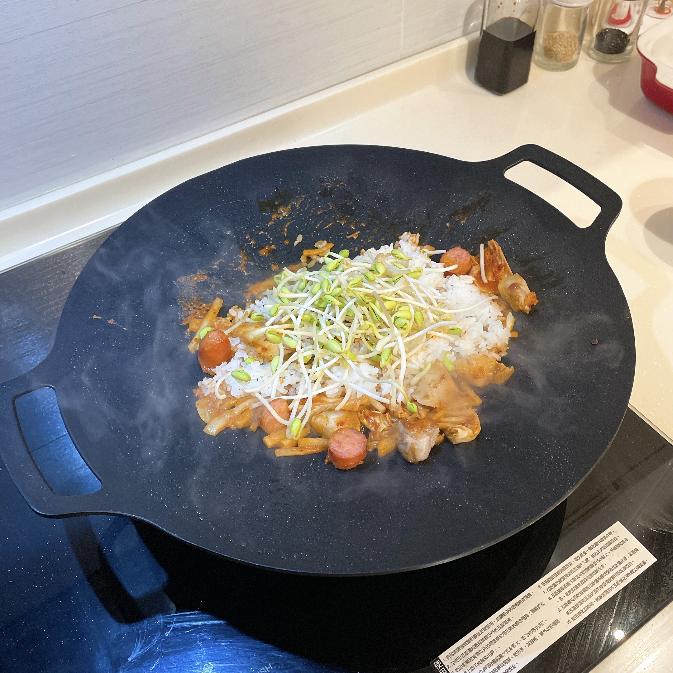烤肉快吃完時,可以將沒吃完的肉品剪成小塊,加入白飯(1碗)、黃豆芽(50g)、泡菜(50g)、韓國辣醬(1大匙)、醬油(適量)製作泡菜炒飯。