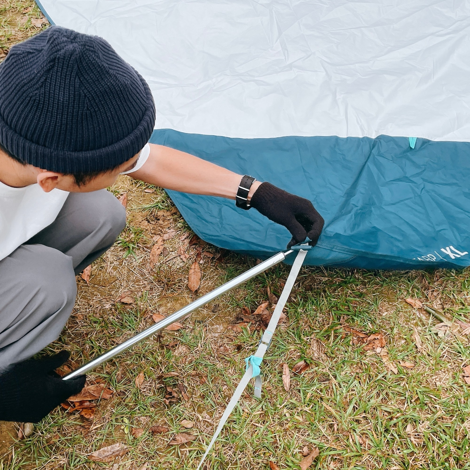 最後將拉至緊繃的營繩以營釘在地上固定;另一側的天幕腰封處也是重複上述動作套上第四根營柱(底段營柱x1、中段營柱x1、頂段營柱x1)。