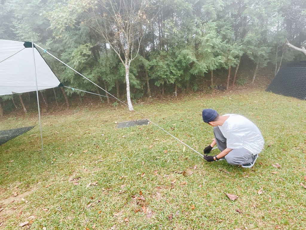 先固定梯形天幕四角,將抽出的營繩拉至最長,套入營釘後使用營槌以45度斜角敲入土裡,並重複以上動作固定四角。