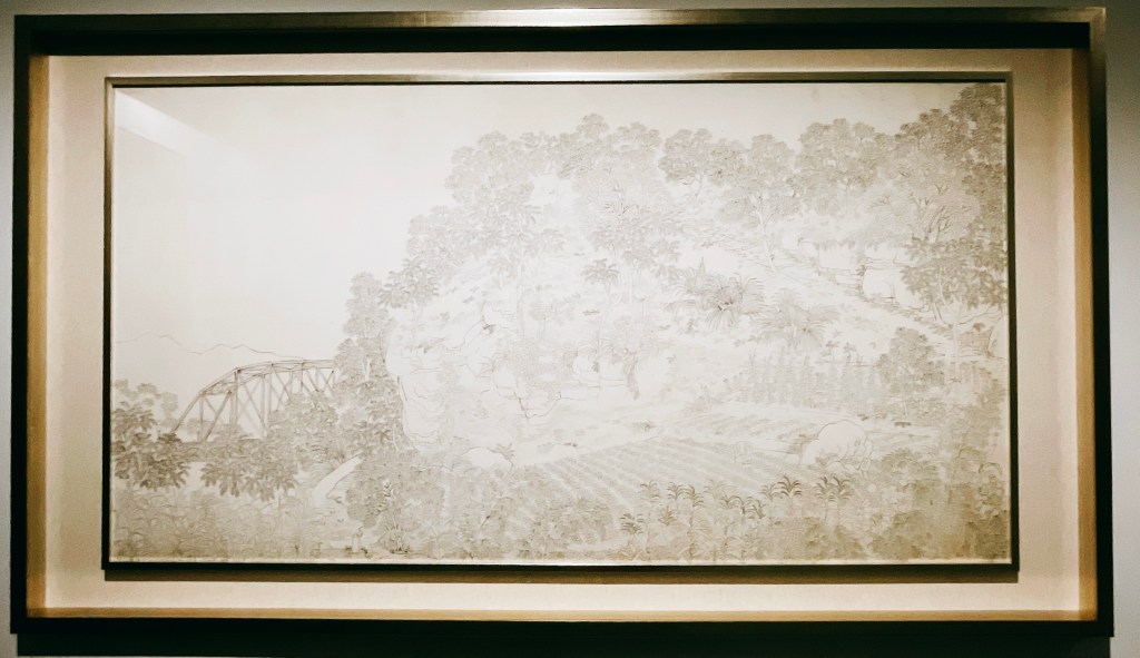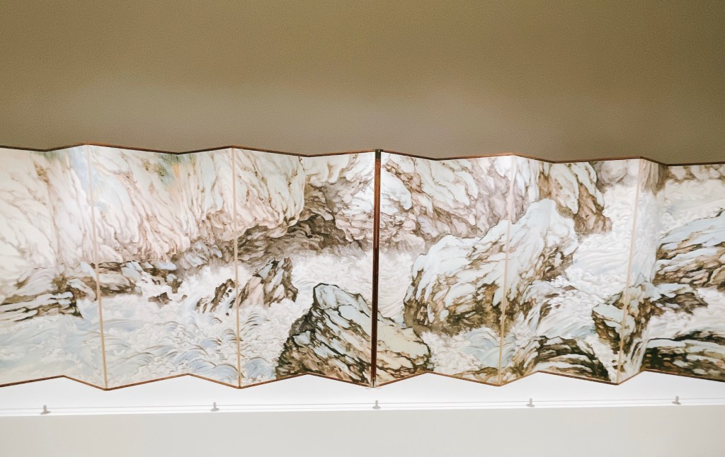 以水墨巨幅屏風呈現太魯閣奇岩與湍急溪水,動感線條彷彿讓人聽到水流嘩啦嘩啦,太魯閣的魅力盡收眼底。