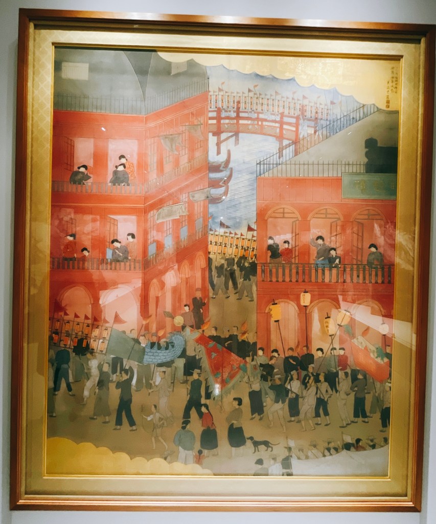 畫作裡中元節遊行隊伍及看熱鬧的民眾大多穿著漢服,但台人男子髮型絲毫不見滿清舊俗剃髮編辮,民眾們穿梭於紅色洋房圓拱式陽台走廊建築群中參與傳統廟會盛事,無疑是日本帝國治理下的台灣街景。