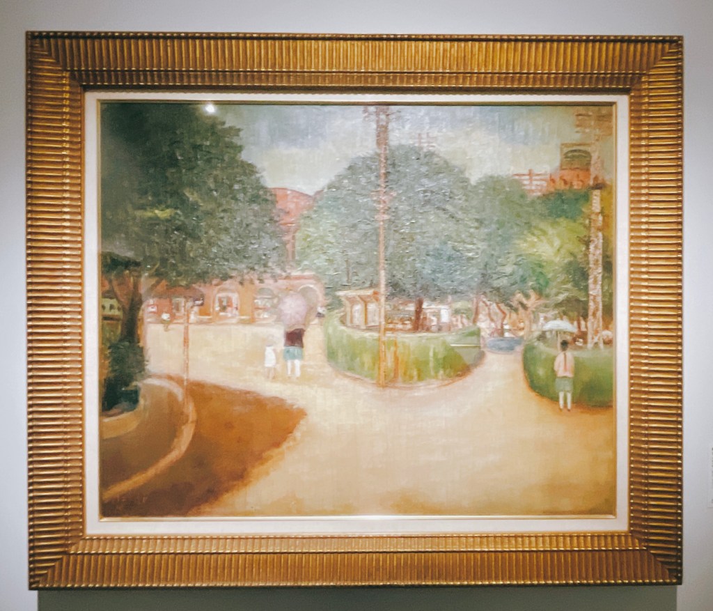 現代化都市的標準配備——公園&草地,陳澄波專注於樹木描繪,以魚眼視角勾勒,讓人彷彿透過魔鏡觀看嘉義公園。