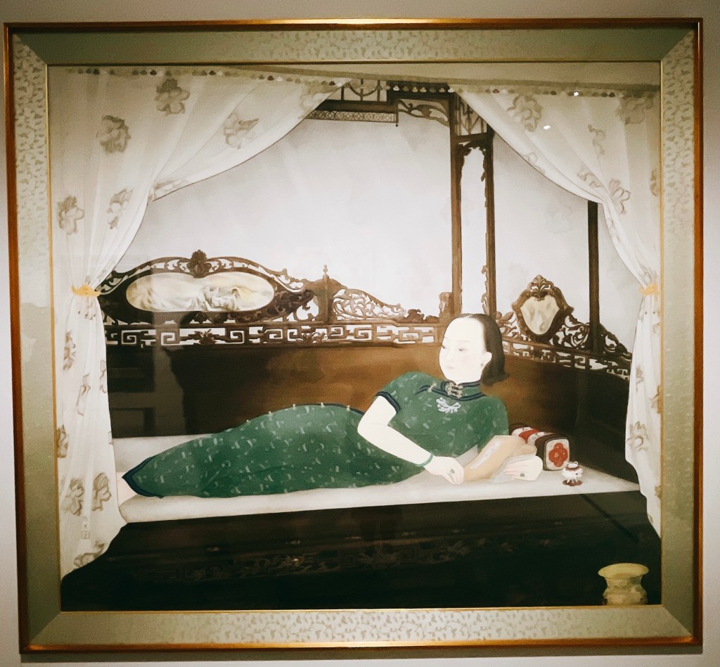 無論作品或個人生活完全體現自由解放『新小婦人』的陳靜,細緻奢華勾勒現代女性在私領域的生活樣貌。穿著改良式旗袍,臥榻上綴有元寶亮片及縷金裝飾,淨白且知性的女子聞著薰香看書慵懶度過閒暇時光。