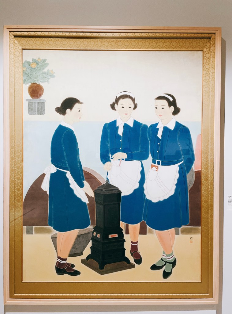 店員圍裙口袋內的點餐單上的戰車標誌,是戰時日本常見的圖樣設計。畫家運用沈穩的藍色和悠哉的店員,積存戰爭期間難得可貴的小閒時光。