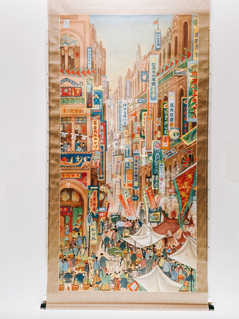 廟會市集使用純色布棚遮陽,襯托高彩度的兩側招牌及絢麗的中元普渡旗幟,畫面色階熱鬧而不雜亂。搭配猩紅色廟宇建築及兩側高聳誇張的洋樓,視覺因此聚焦收斂於畫面下方,呈現台灣市井小民的日常生活。
