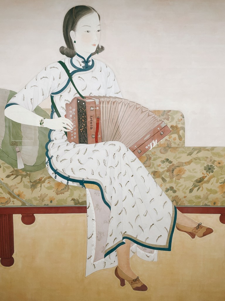 穿著高跟鞋演奏西洋手風琴的時髦女子,坐在貴妃椅上演奏。「女生也要培養自己的興趣」這很像是陳進想和大眾傳達的新觀念,對事物保留好奇心向未知探索。