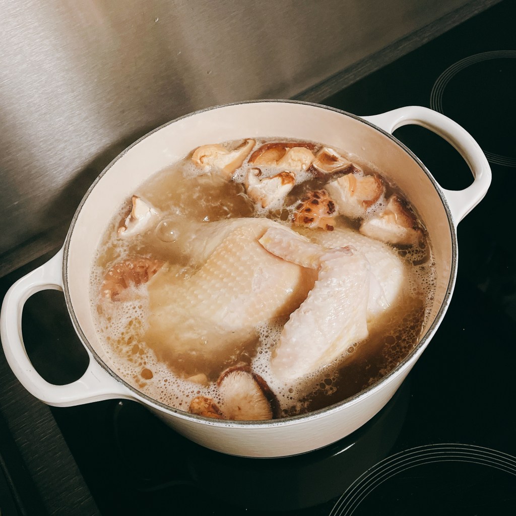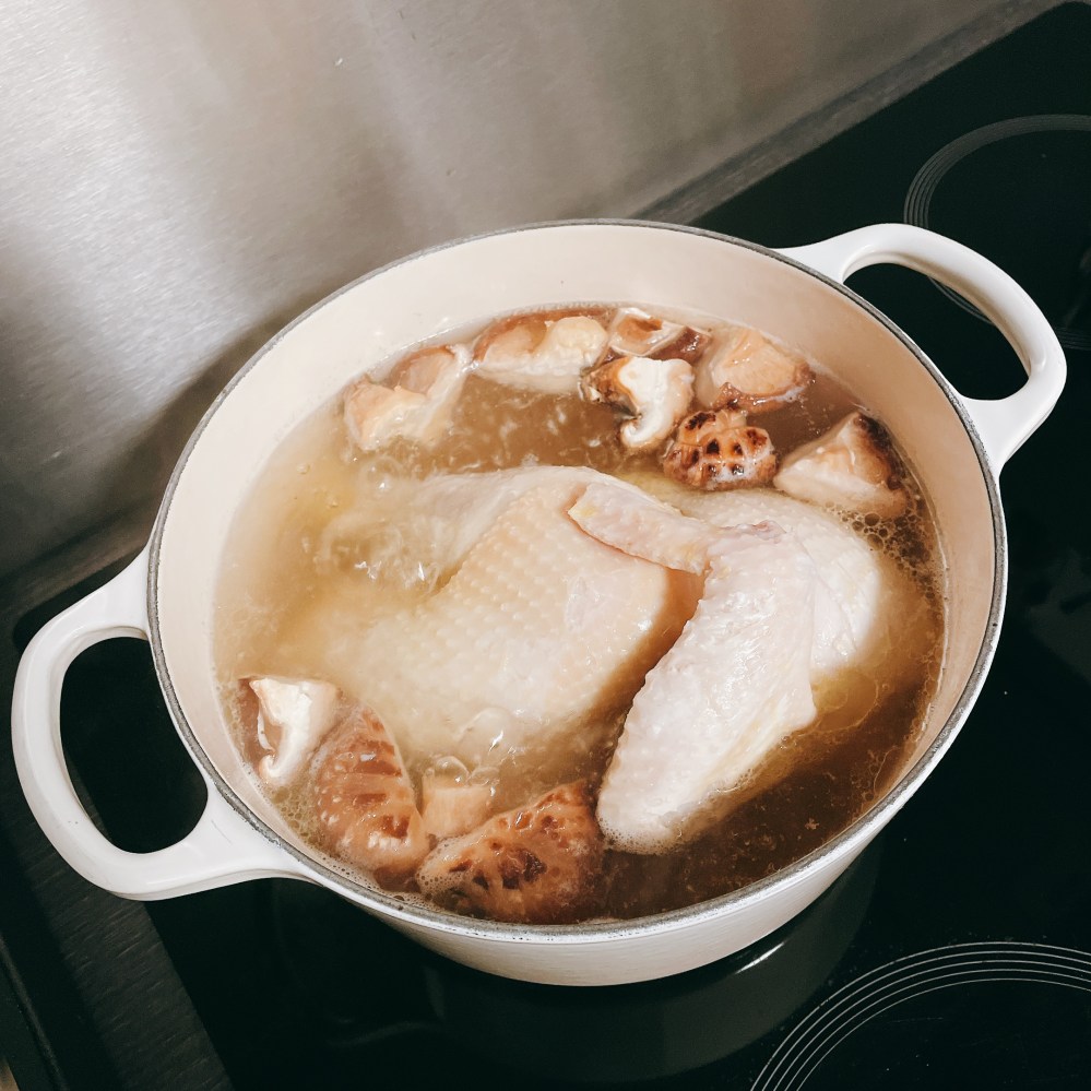 將放牧雞(半隻)、泡開的花菇(3朵)切塊、泡開的干貝(10顆)、泡乾貨的水(500ml)和另外新的水(1000ml)加入Le Creuset鑄鐵鍋中煮滾,
