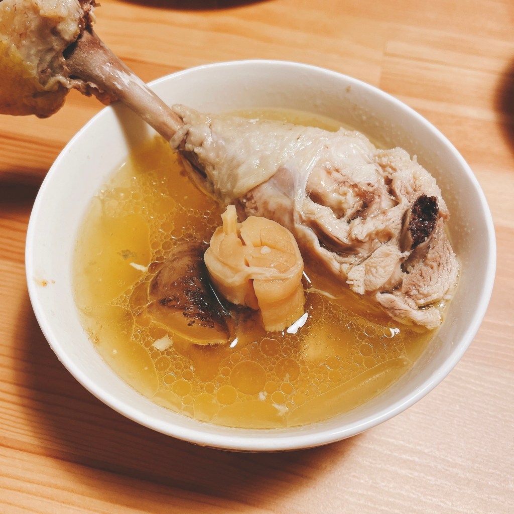舀一匙雞湯,濃郁的湯頭吸收花菇與干貝迷人的日月精華,泡點米飯進去,呼嚕呼嚕,一鍋雞湯,一餐吃光光。