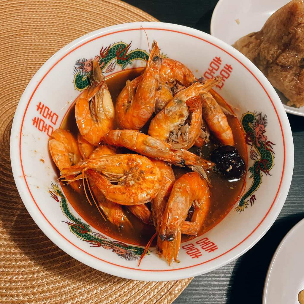 第一餐沒喝完的燒酒雞雞湯,隔天可以加入適量水稀釋後,和蝦子一起放在電鍋內蒸熟,簡單凝鍊一碗公山珍海味!