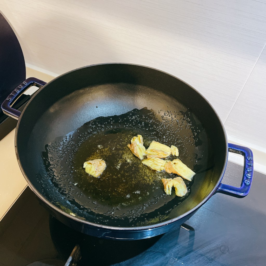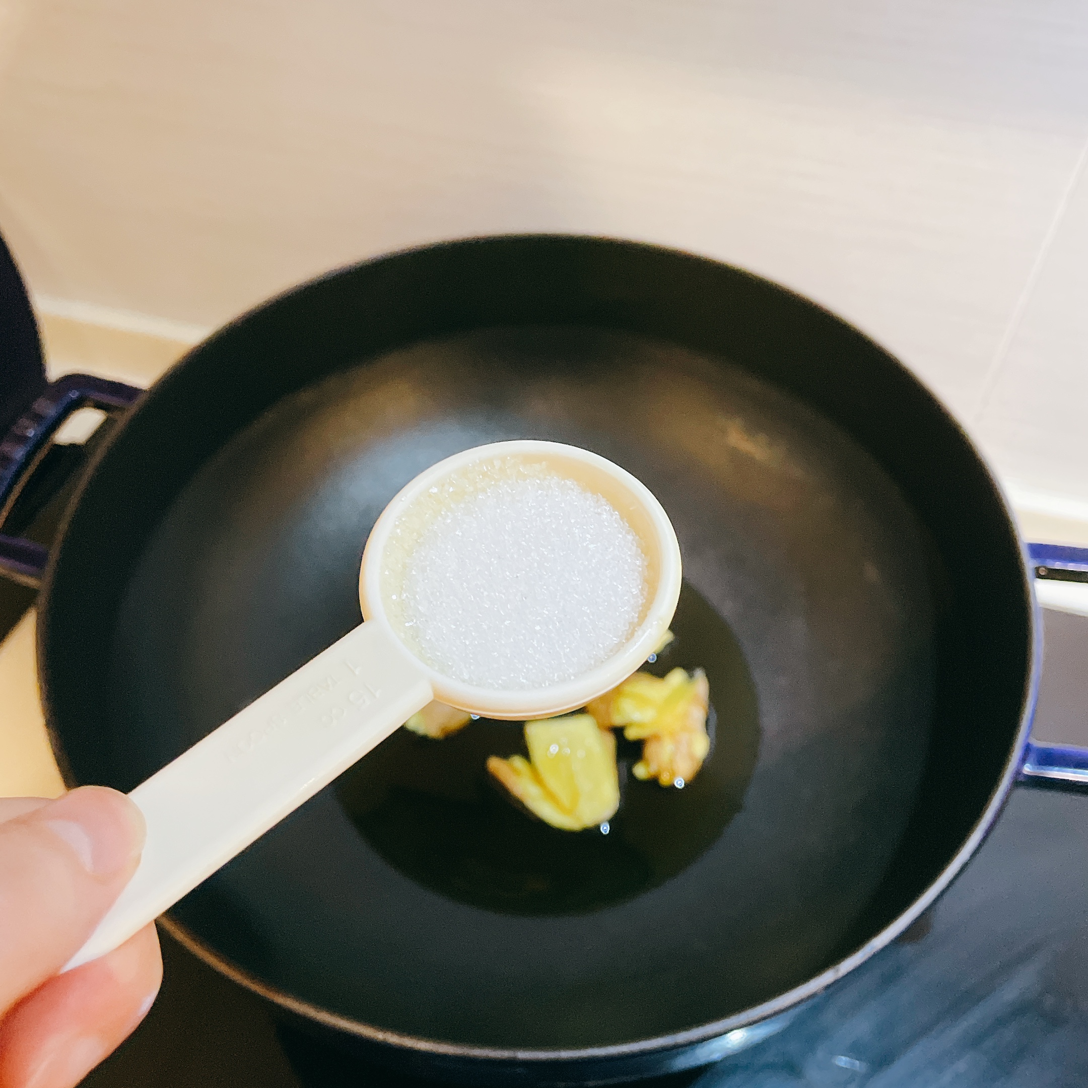 鑄鐵鍋加入拍扁的老薑(20g)、麻油(5大匙)、砂糖(2大匙),