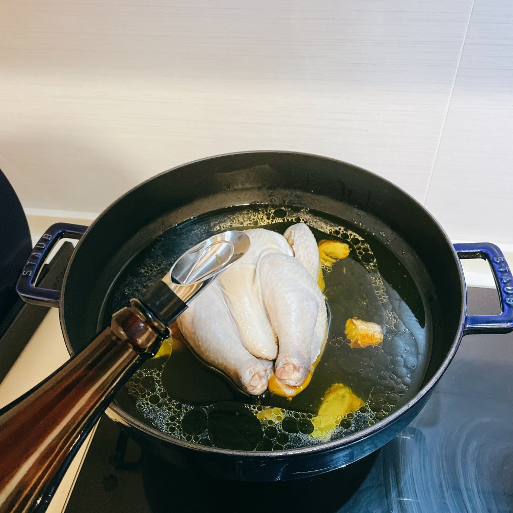 將完全解凍的春雞(1隻)洗淨後加入水(1000ml /或可淹過全雞)小火從冷水煮到全滾,熄火