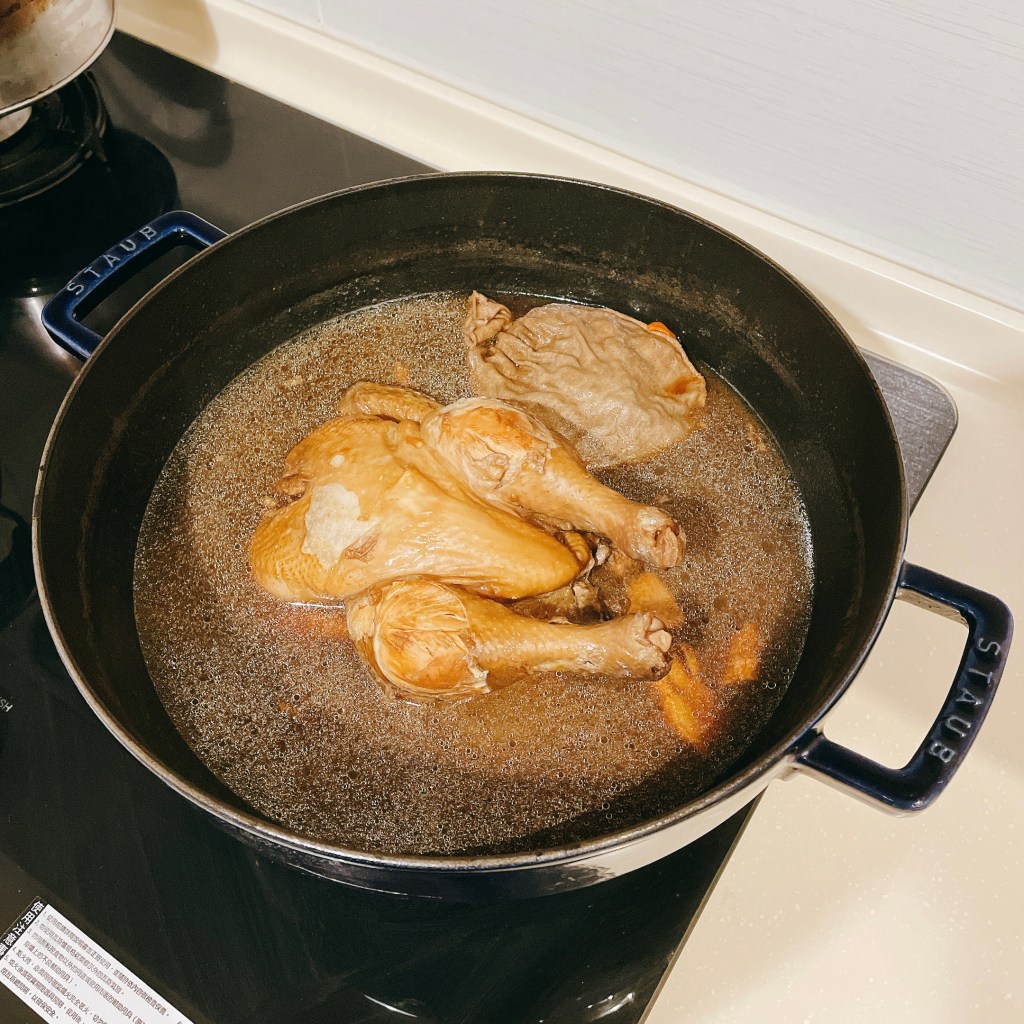 用筷子戳進雞胸肉部位,若可輕易抽出來且無卡肉渣,代表春雞大致已熟透,熄火。蓋上鍋蓋,用鑄鐵鍋的餘熱續悶20分鐘,一隻雞風格燒酒雞就完成囉!