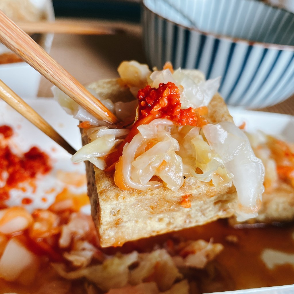辣椒是直辣舌頭的那種吃不消辛辣,但酸甜的泡菜和甘味醬汁成功中和辣度,讓這款巨人一口酥出乎意料地耐吃!外帶回家的臭豆腐因為炸到酥脆因此沒有因悶在紙盒內導致軟化!