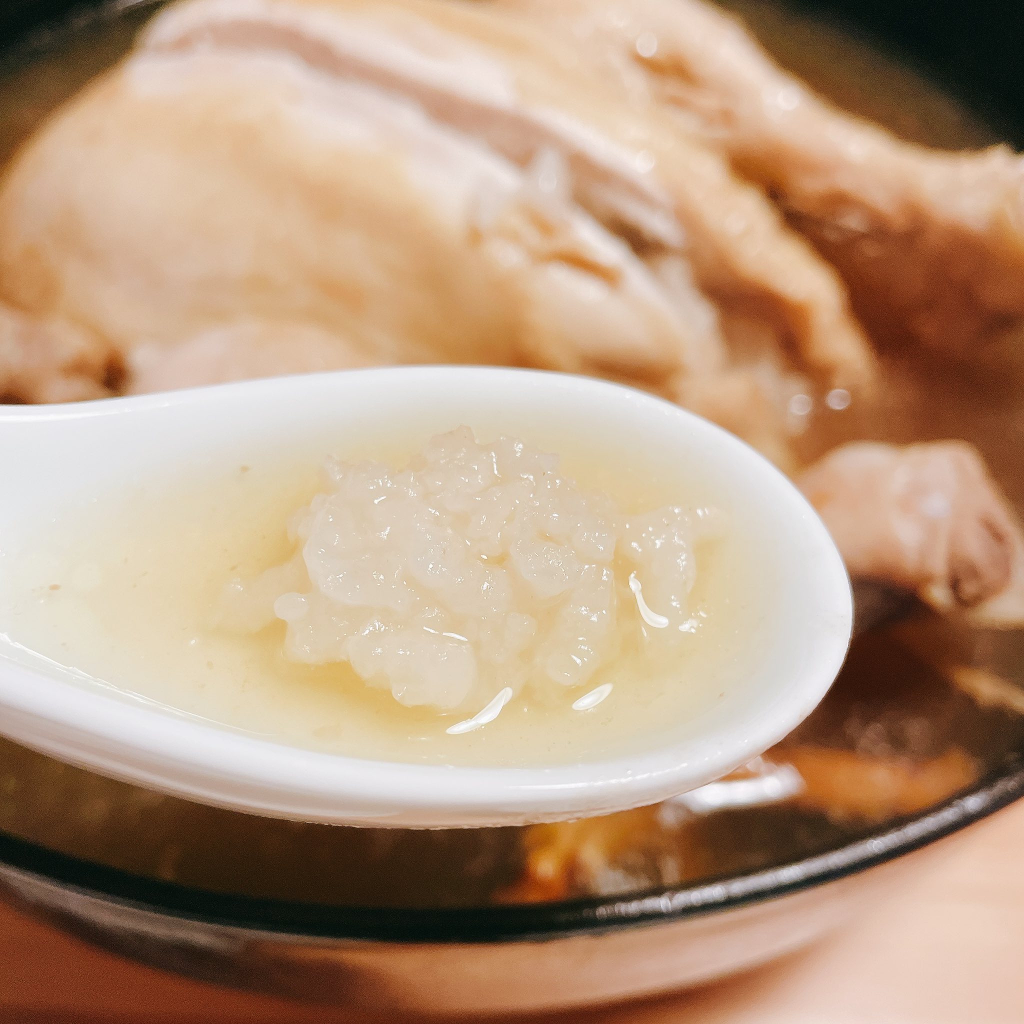 筷子輕輕一碰就「骨肉分離」的鮮嫩雞腿,金黃澄澈的湯頭完美鎖住人蔘與其他藥材的精華。