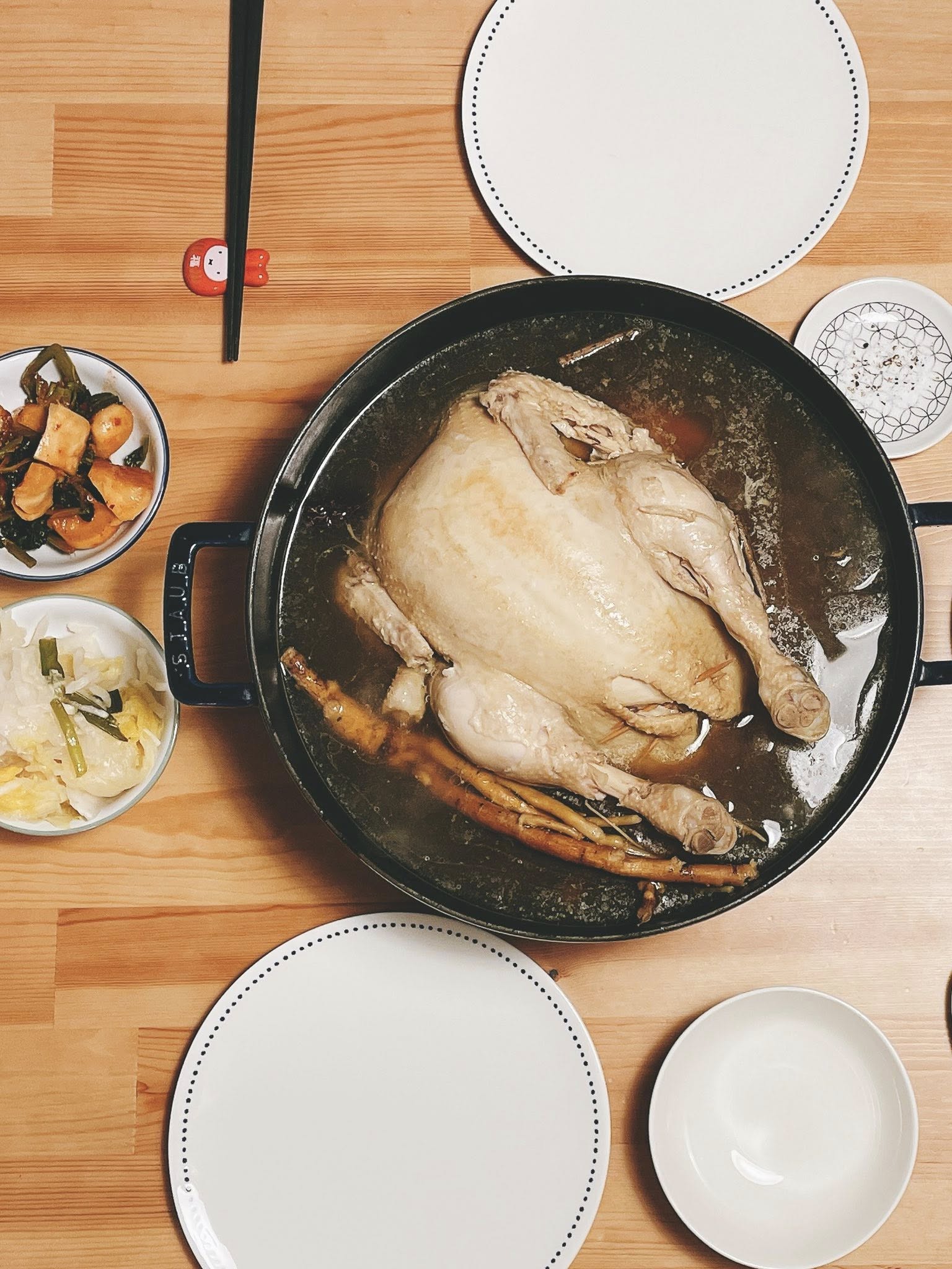 普遍來說在韓國吃到的蔘雞湯為了追求肉質軟嫩不柴,大多使用小巧的春雞塞進糯米、人蔘、紅棗、大蒜經長時間小火燉煮。但其實如果使用鑄鐵鍋,就算是一般大小的放牧雞也可以燉出鮮嫩多汁又濃郁的蔘雞湯喔!