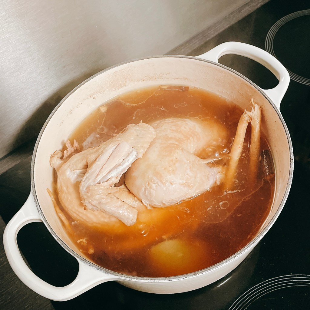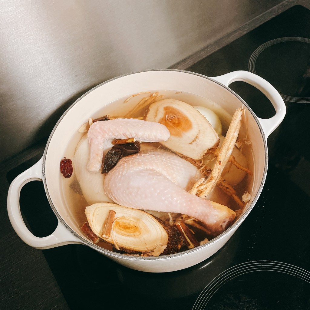 接著把切半的洋蔥(1顆)、撥好皮的西班牙黑蒜(1顆)、韓國蔘雞湯藥材(1包)、水(1500ml)和處理好的放牧雞(半隻)放進Le Creuset鑄鐵鍋,水煮滾後轉成小火燉30分鐘。