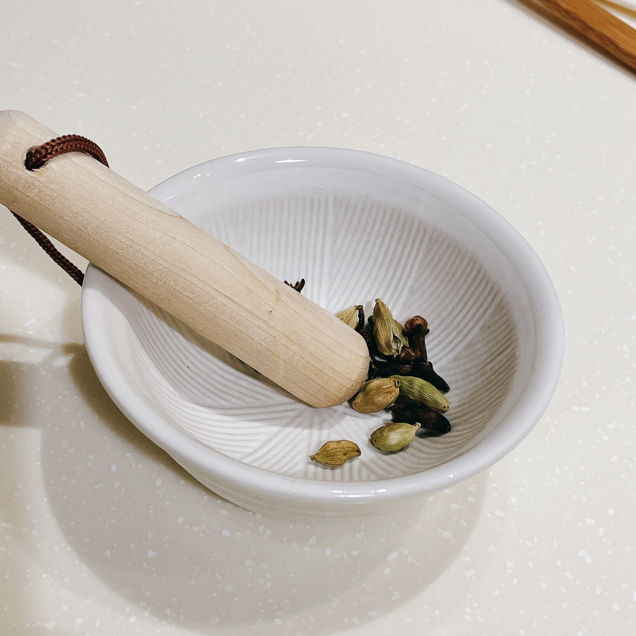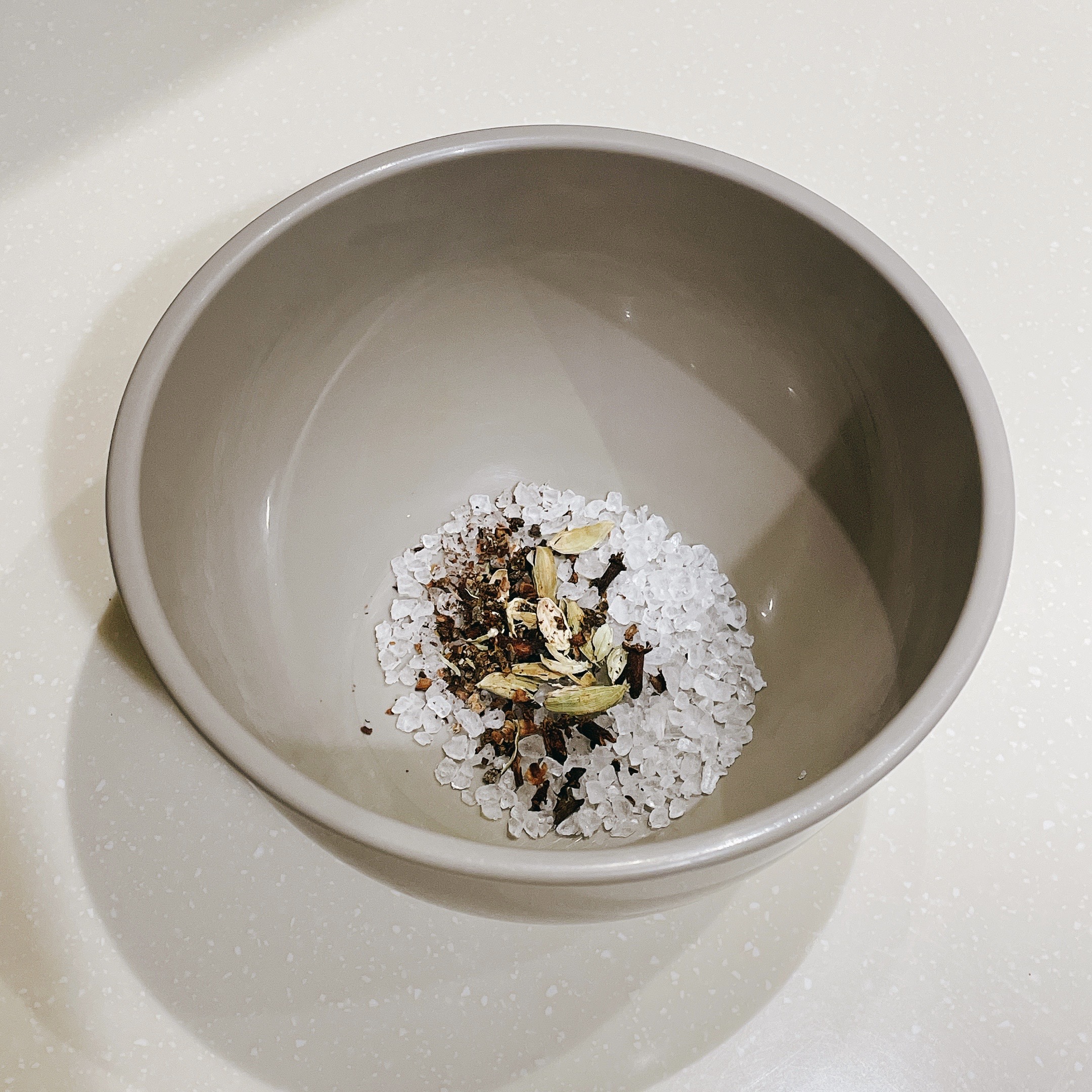 接著使用研磨缽將炒香的綠豆蔻和丁香磨碎,並與粗海鹽(15g)均勻混合,